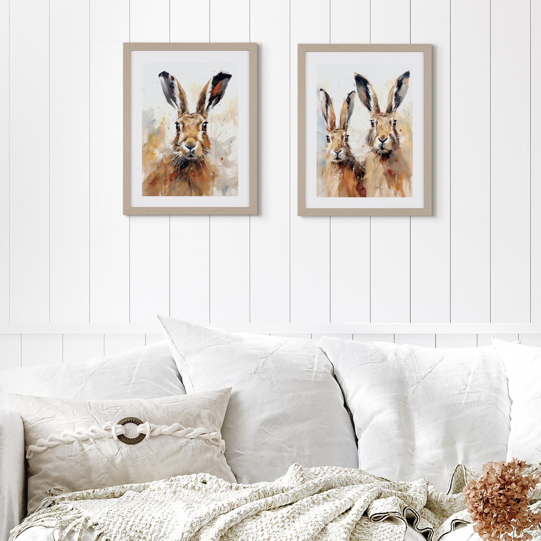 This stunning print by artist Joanna Lea depicts a solitary hare in a range of soft pastel shades, capturing the essence of its character. With striking eyes, the inquisitive creature gazes out, while its unique long ears and defined nose are brought to life through careful brushwork. Finished with a contemporary frame in a natural oak tone. Works well with Hattie & Harold by the same artist if you are looking for a pair.