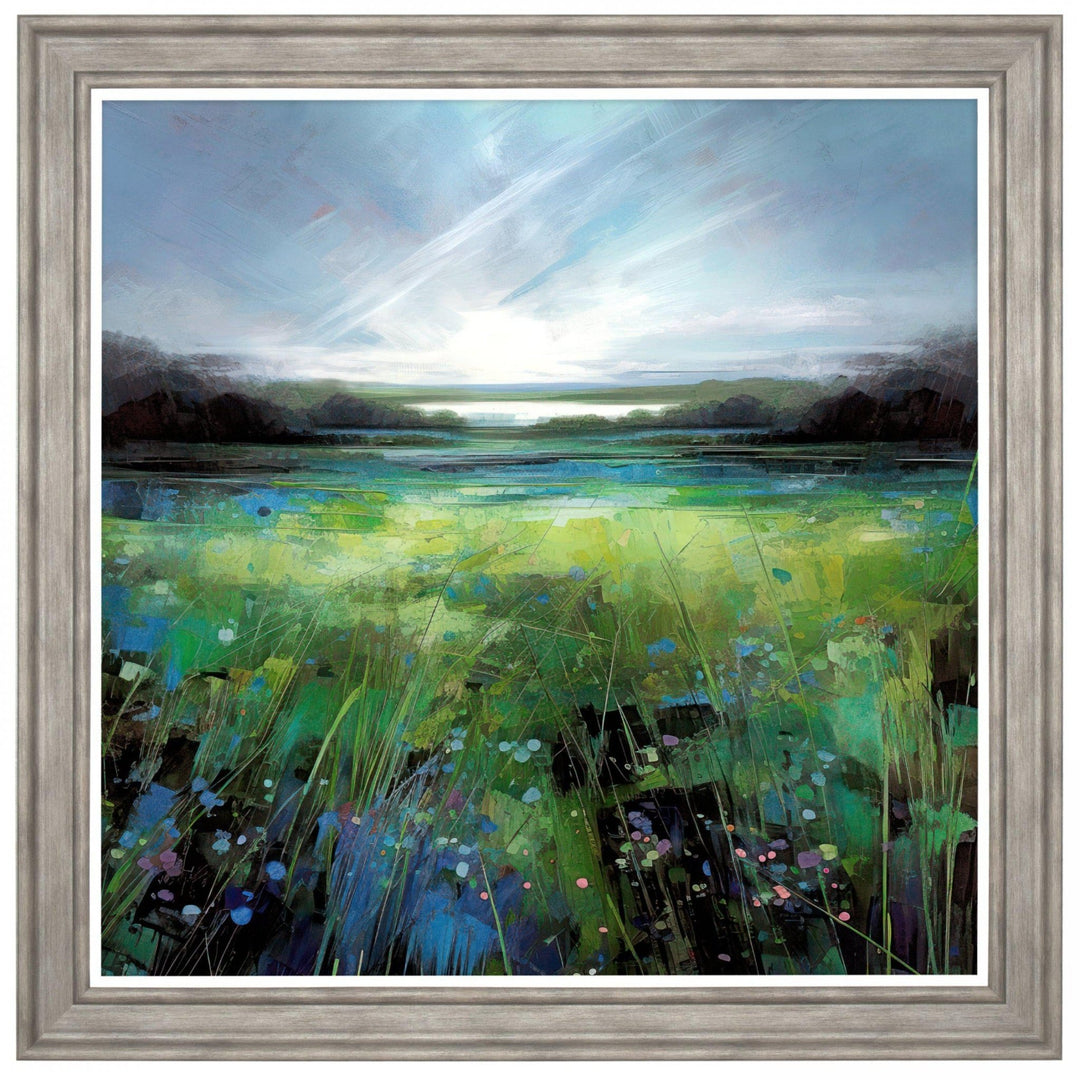 Time Stands Still is a gorgeous brightly coloured print looking across the field with the clouds highlighted by the sunshine. Its greens and blue colouring provide a fresh feel making it a perfect picture for a lounge, bedroom or hallway. Also available in a smaller size.