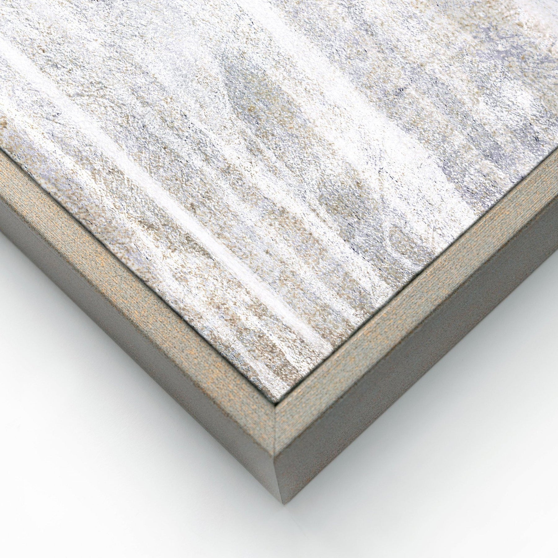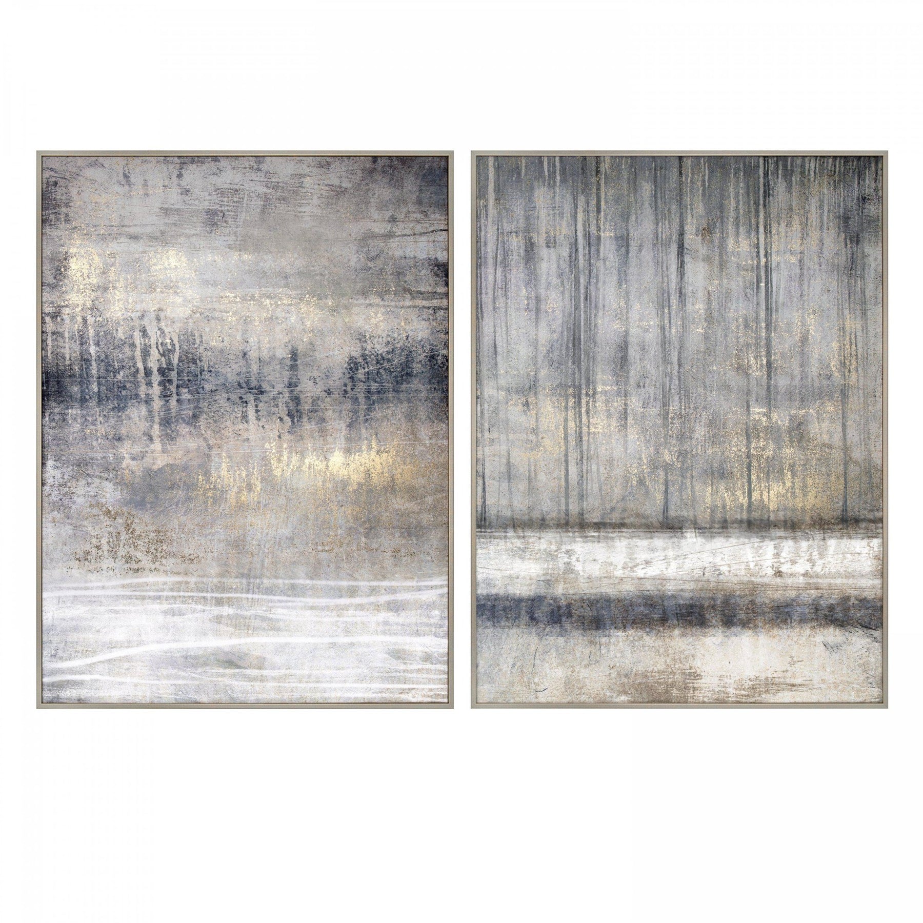 Torrent is a pair of pictures by Sabrina Roscino. The abstract pieces have muted tones of grey, deep indigo and glistening gold foil metallics that enhance its design. The modern artwork will enhance any living space.