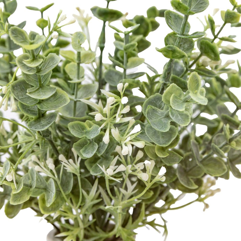 This stylish retro vase brings a fresh touch to any space. Featuring lush green meadow foliage accented with eucalyptus stems, it is perfectly paired with a trendy white vase showcasing a classic retro pattern.