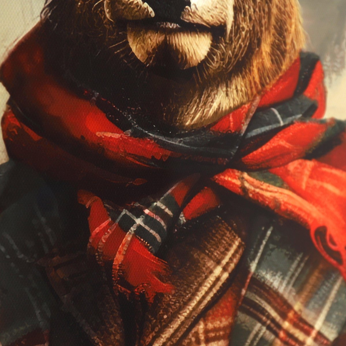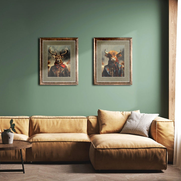 This artwork features a youthful stag dressed in authentic Scottish clothing, complete with a tartan blazer and a shaggy red scarf. The intricate background adds depth and complexity to the composition, showcasing Faye Reynolds-Lydon's fusion of natural beauty and elegant fashion. A textured bronze frame with a white inner lip highlights the rugged beauty of the Scottish Highlands and draws attention to the traditional olive-green mount. Partners well with Dapper Highlander by the same artist.