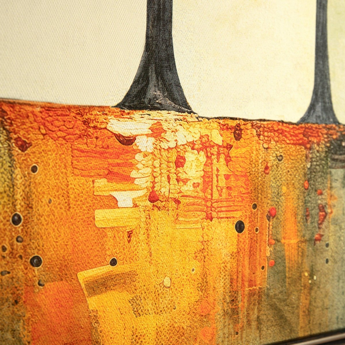 This impressive artwork captures the tall trees on the horizon with bold, intense paints, creating a vibrant and dynamic composition. The artist, Faye Reynolds-Lydon, expertly chooses a decorative ribbed profile for added texture and depth, while the use of a golden yellow tree in the center adds warmth and a sense of depth. The final touch is the dark blue with a golden texture, elegantly wrapped around the moulding.