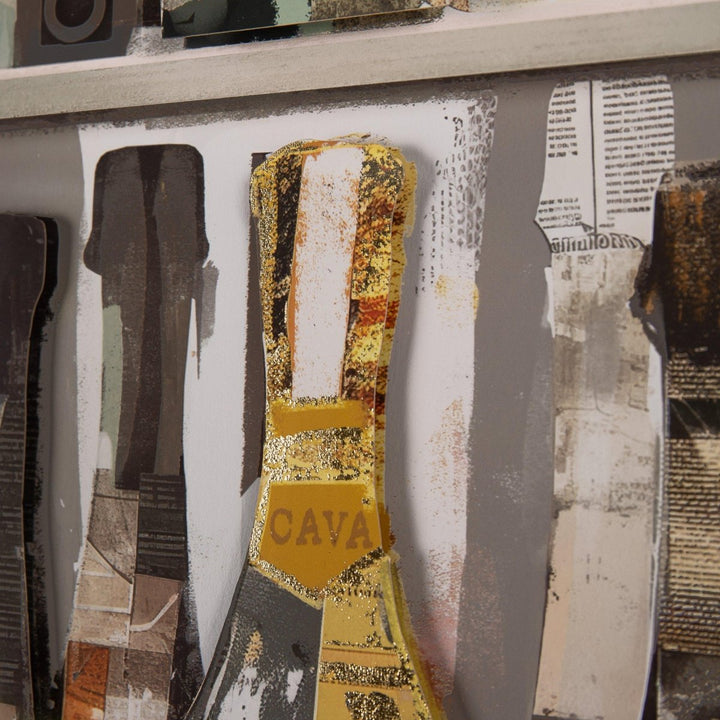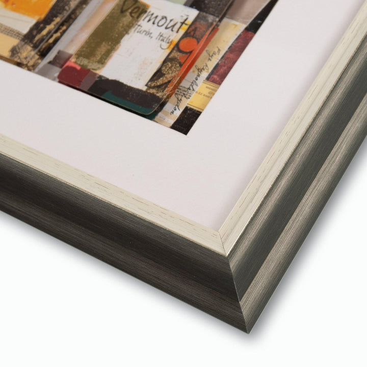 Faye Reynolds-Lydon's Wines of the World is a stunning tribute to global wine culture, featuring a diverse display of wine bottles in a vibrant collage. The artwork showcases the unique personality of each bottle and creates curiosity with its layers and use of metallic foil. It is elegantly styled with a white mount and slimline wood frame with champagne silver edging.