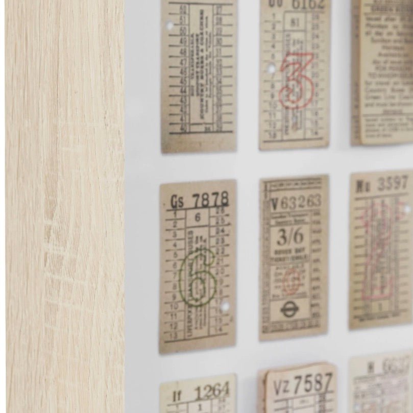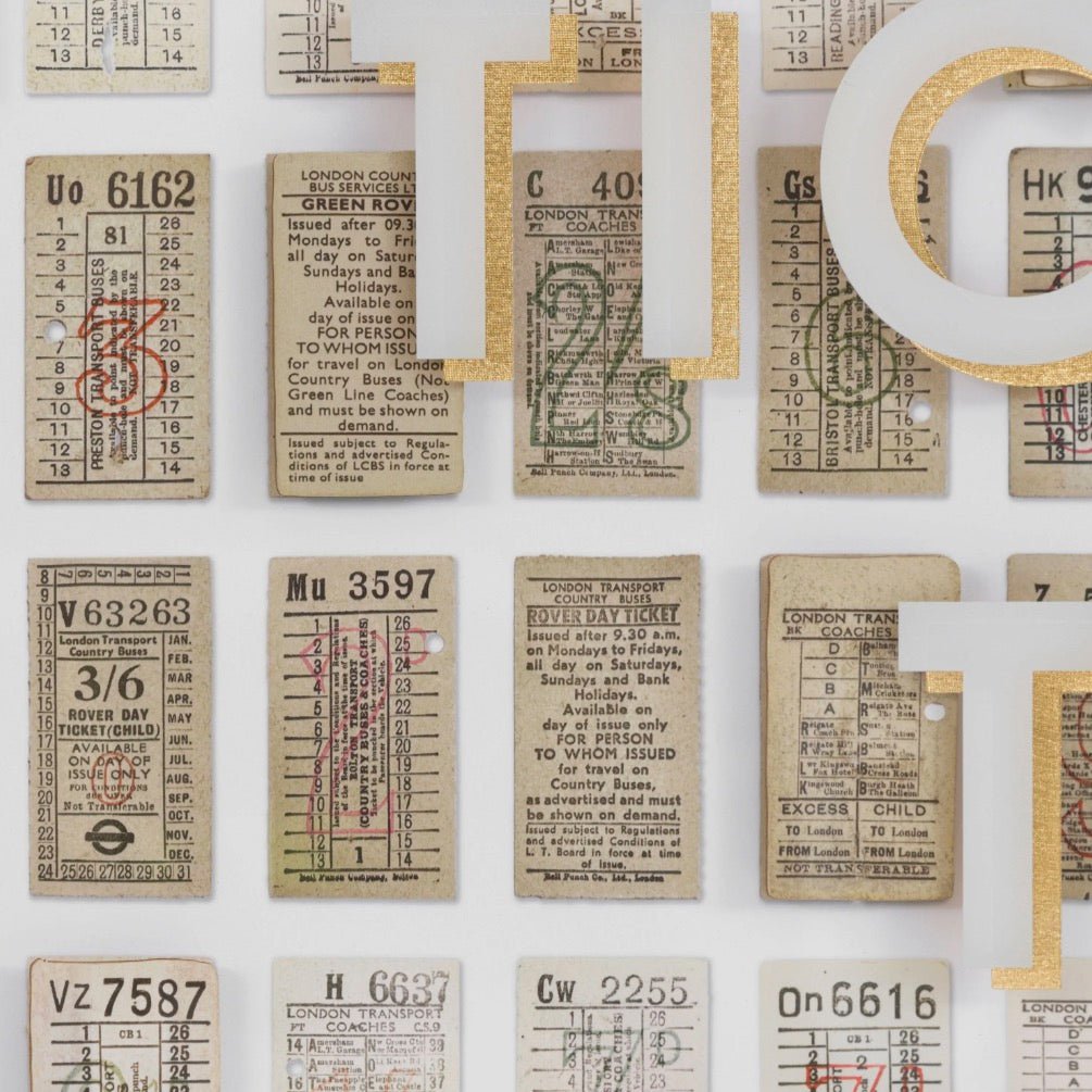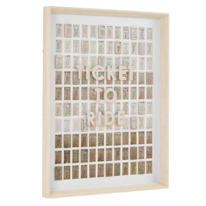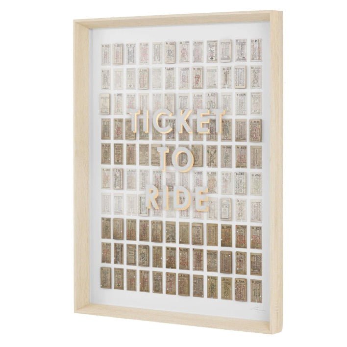 This mixed-media artwork celebrates vintage bus tickets from the 1930s-1950s, layered within a modern shadow box frame. Muted tones and strategically raised tickets create visual depth, while "Ticket to Ride" is silkscreened in white and gold foil across the glass for added shimmer. A beautiful fusion of nostalgic travel memorabilia and contemporary design that evokes both wanderlust and the passage of time.