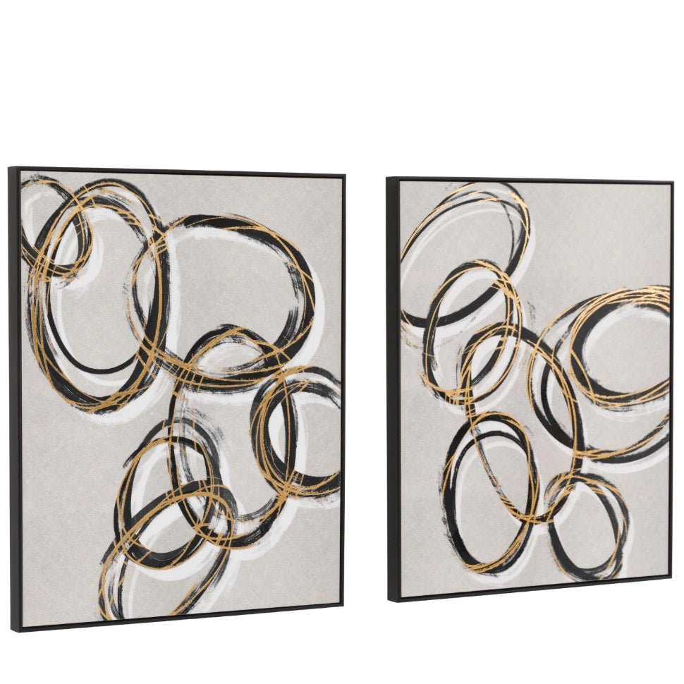 A striking pair of artworks featuring sleek circular designs in warm neutral tones, enhanced with luxurious gold foil details and a polished finish. Perfect for adding a touch of modern sophistication to any room.