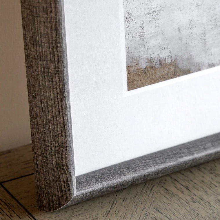 Two abstract landscape prints in soft greys and taupes, framed in weathered oak. Their gentle, layered design creates a calm, contemporary look that complements any room with understated elegance.