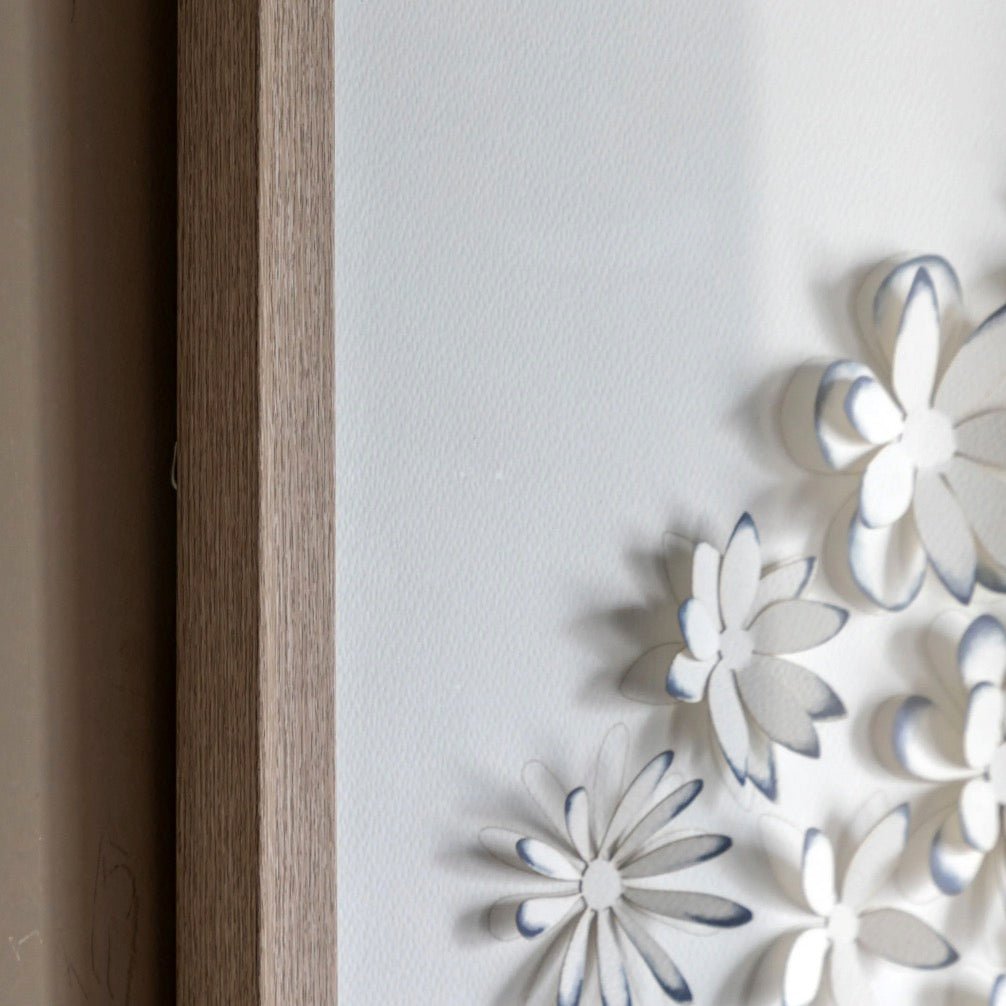 Unfurling Petals by Nicole McHugh brings a delightful three-dimensional artwork featuring intricately die-cut florals printed on sumptuous watercolour paper, with each petal cleverly layered and lifted to create playful shadows and genuine depth. The result is a piece that practically springs off the surface, inviting you to admire it from every angle. Soft, textured, and wonderfully tactile, it captures the essence of flowers in full bloom. Housed in a stylish shadow box frame with warm muted oak tones.