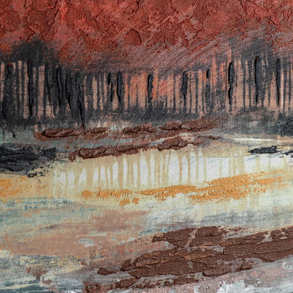 This Vibrant Vision framed canvas brings a slice of autumn woodland straight to your space. Golden ambers and deep rusts blend beautifully with cool water blues in this serene scene. Perfect for adding a touch of nature's peaceful charm to any room.