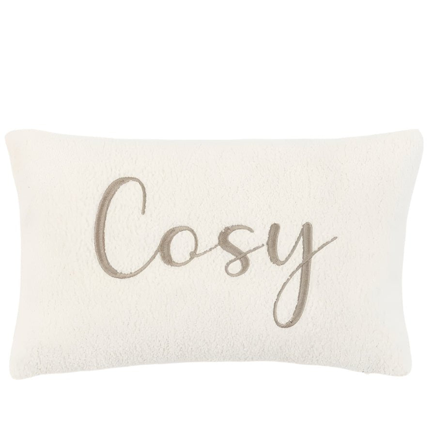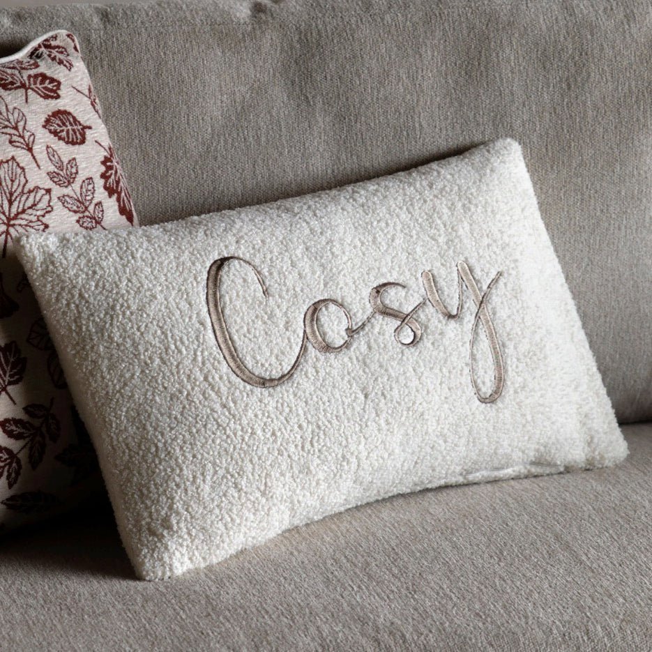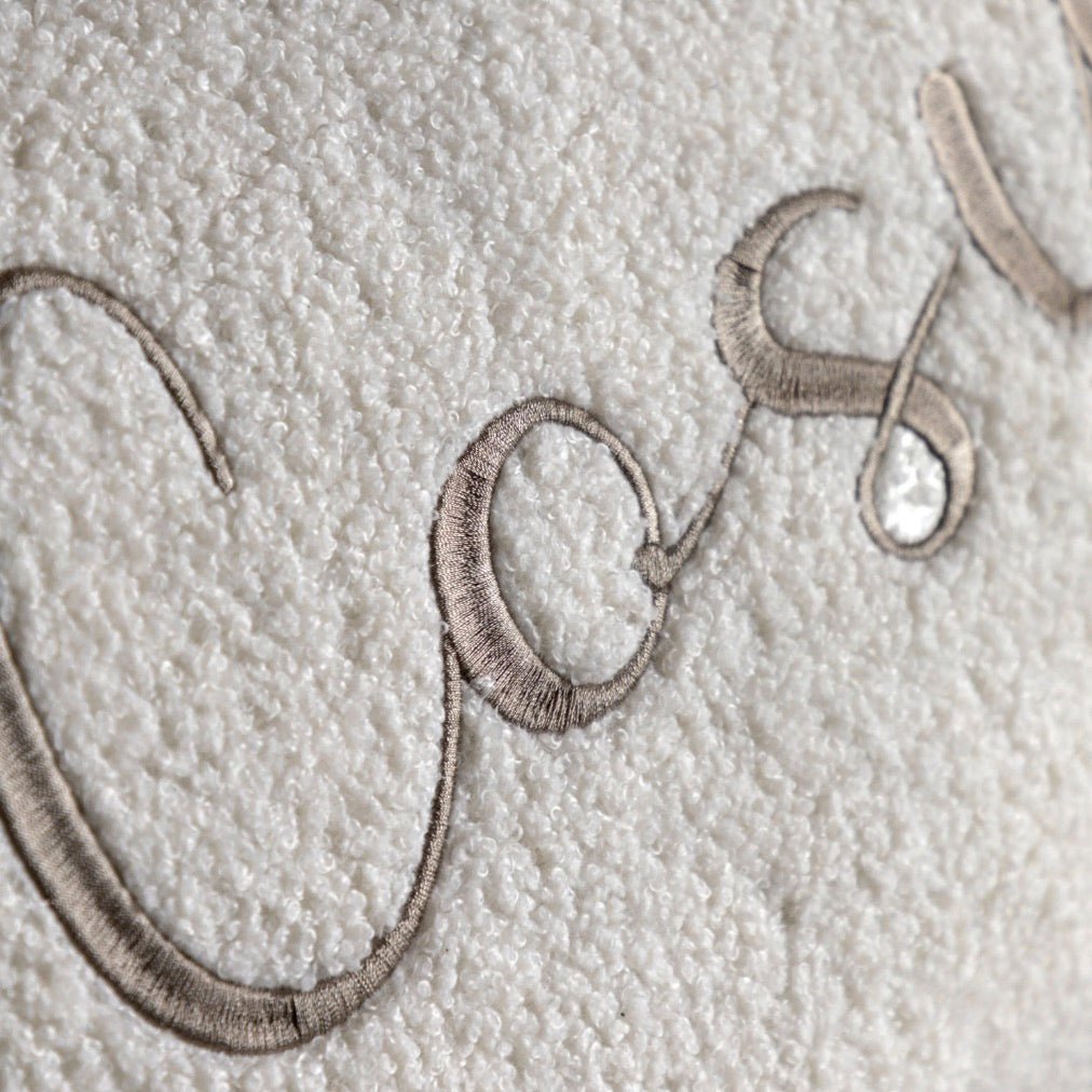 Crafted from luxuriously soft boucle fleece, this Cosy embroidered white cushion combines tactile comfort with elegant design. The delicate embroidered lettering adds a refined touch, making it a sophisticated accent for any living space. Its plush texture invites relaxation, while the neutral cream tone complements a wide range of interiors.