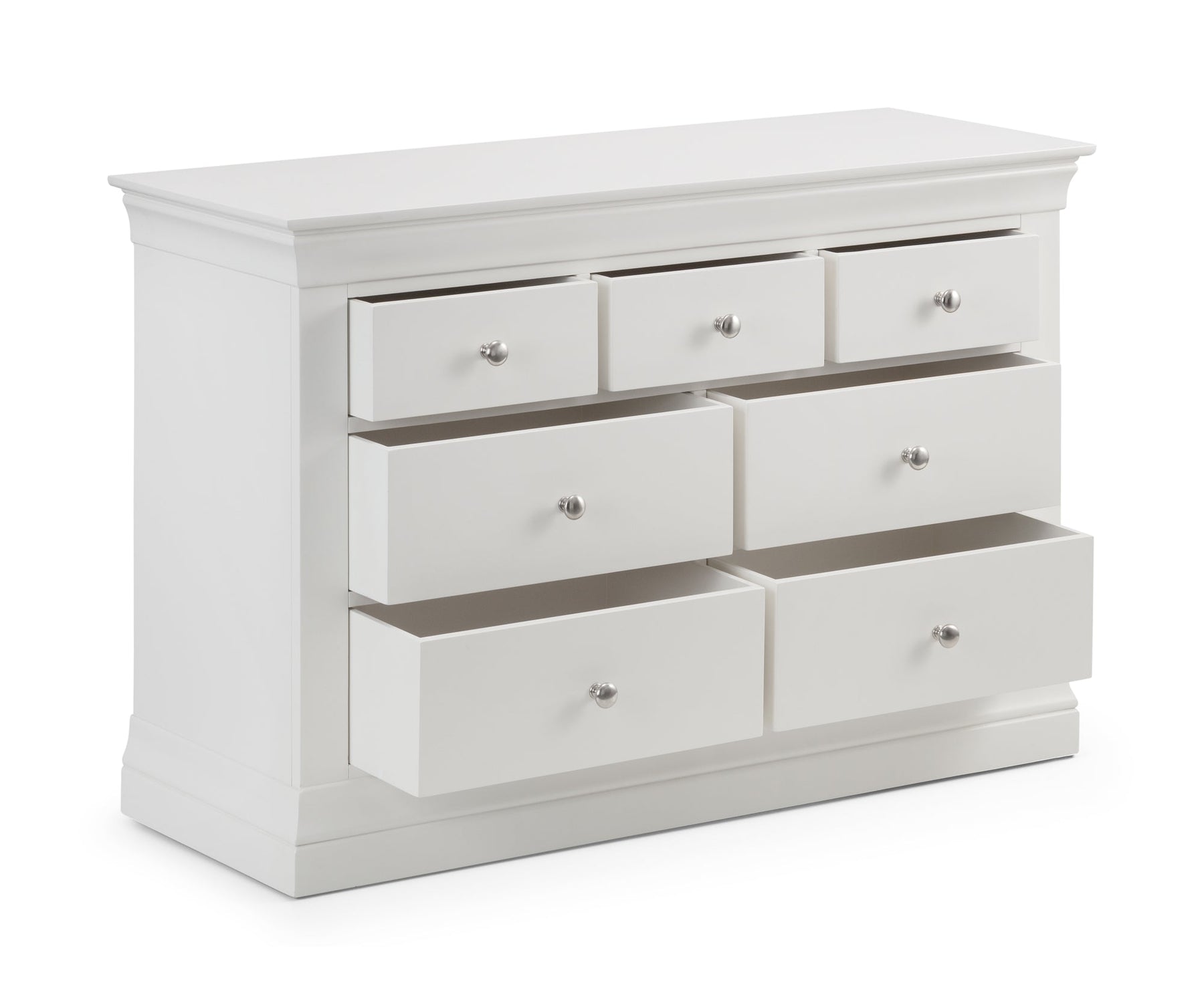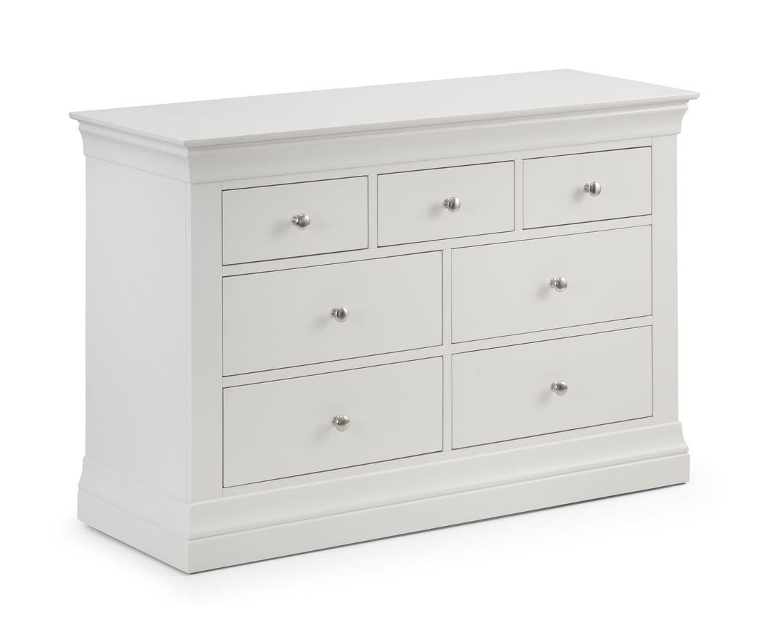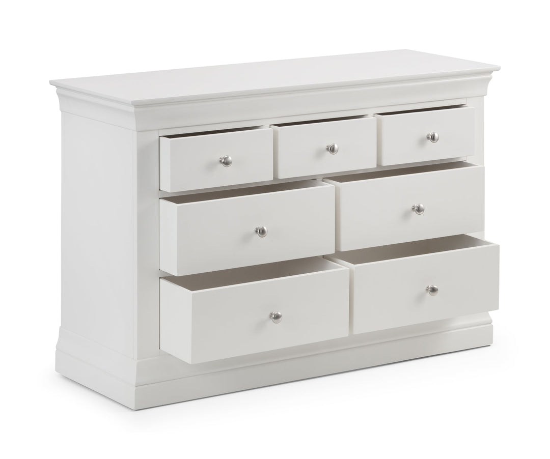 The timeless style of this Clermont White 3 over 4 Drawer Chest of Drawers from our bedroom collection in a white lacquered finish can be enjoyed in interiors of all styles. The 3 smaller drawers over the 4 larger drawers provide a good mix of storage. The perfect way to bring a touch of class and character.