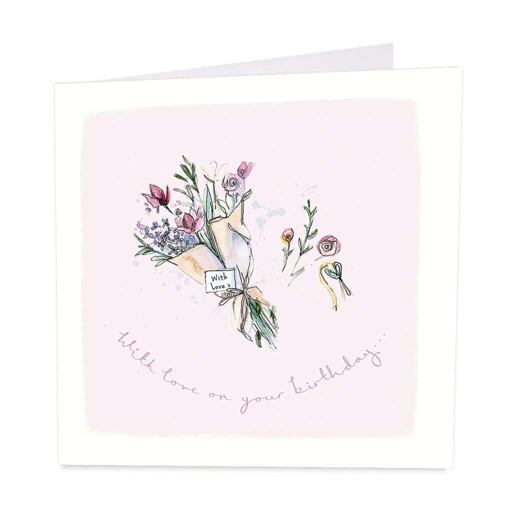 This birthday greeting card features a wild flower bouquet which has been finished with a subtle silver glitter. The bouquet is finished with paper, string and a tiny label that says 'with love'. The text below reads 'with love on your birthday- a perfect card to send a loved one on their special day. This card is produced from sustainable wood pulp sourced from responsibly managed forests and is accredited with the FSC logo. We can send directly to the recipient with handwritten message.