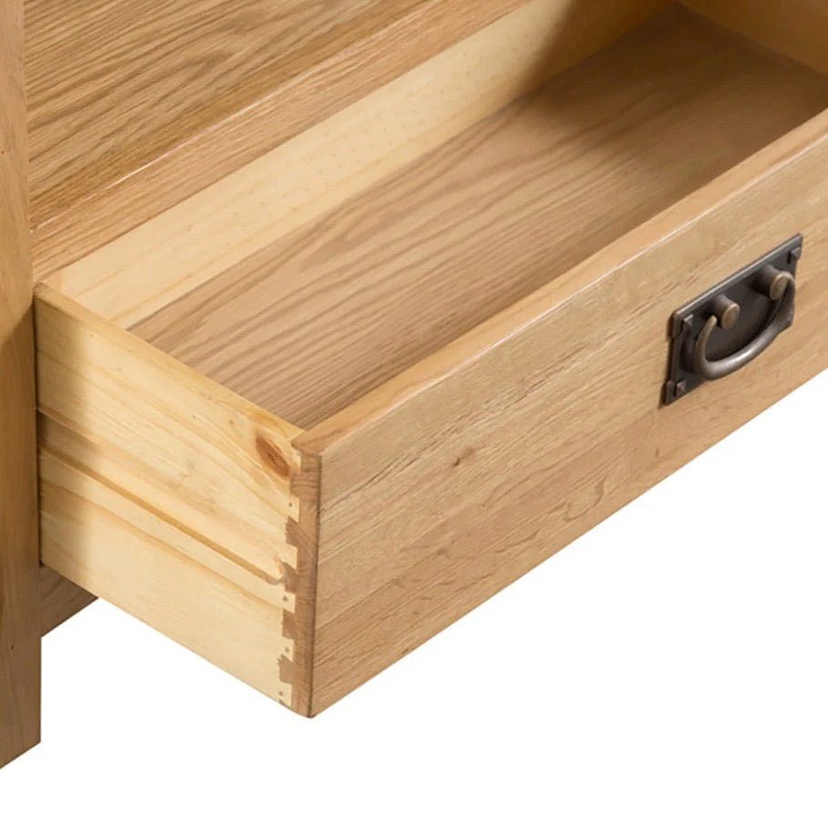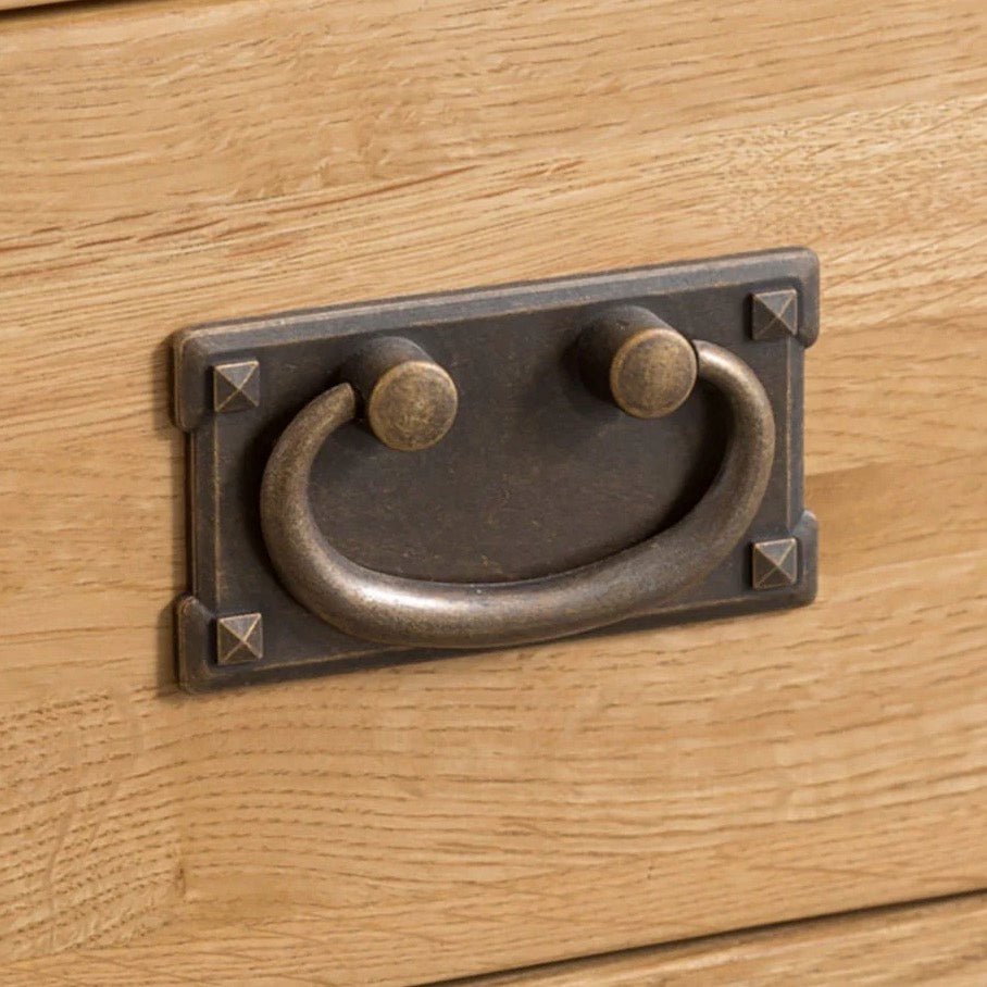 The Kirdford Oak tall bookcase has 5 shelves and and a low drawer for additional hidden storage. The Kirdford Oak Collection is one of the most diverse available today, meaning that you can find the perfect item, whatever the style or size of home. Beautifully made with a natural finish and antique brass effect handles for a rustic feel that brings a relaxed look to your home.