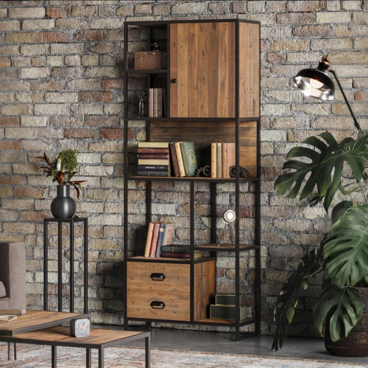 The Ooki large open bookcase features two drawers, a cupboard and display shelving. It is part of a collection that showcases strong commitment to sustainability. All external timbers used are 100% reclaimed and skilled craftsmen leave all nail holes and scars during timber preparation in order to preserve the 'weathered wood' appearance, resulting in unique character for each piece. This is a high-end collection designed to last a lifetime, with a hand-fabricated steel frame and a durable protective finish.