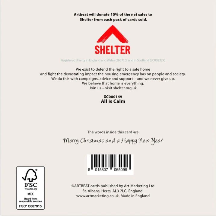 What's not to love with this gorgeous bunny in their red scarf? Each charity card is produced from sustainable wood pulp sourced from responsibly managed forests and is accredited with the FSC logo. The cards support Shelter’s vital charity work in the community.