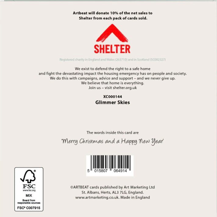 A cheeky inquisitive donkey wearing a holly garland. Each charity card is produced from sustainable wood pulp sourced from responsibly managed forests and is accredited with the FSC logo. The cards support Shelter’s vital charity work in the community.
