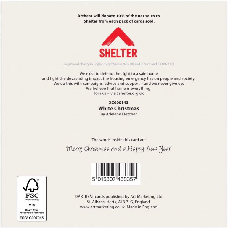 A gorgeous snowy scene with two ponies standing together among the decorated fence. Each charity card is produced from sustainable wood pulp sourced from responsibly managed forests and is accredited with the FSC logo. The cards support Shelter’s vital charity work in the community.