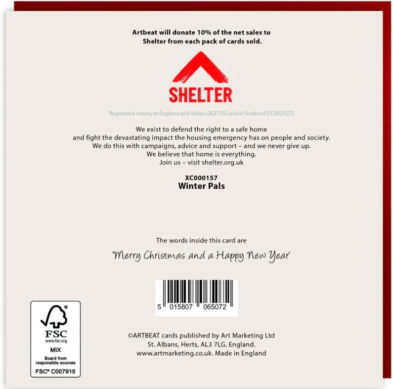 This beautiful fluffy sheep has a friendly robin resting on its head - bound to make the recipient smile! Each charity card is produced from sustainable wood pulp sourced from responsibly managed forests and is accredited with the FSC logo. The cards support Shelter’s vital charity work in the community.