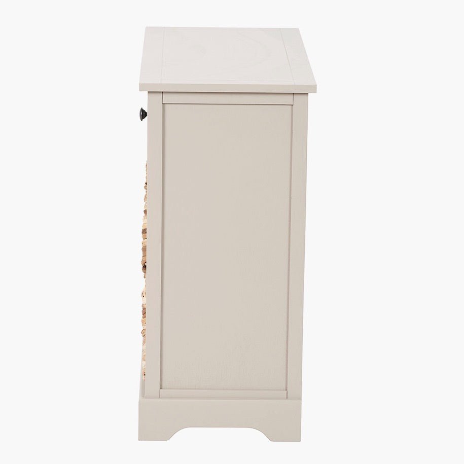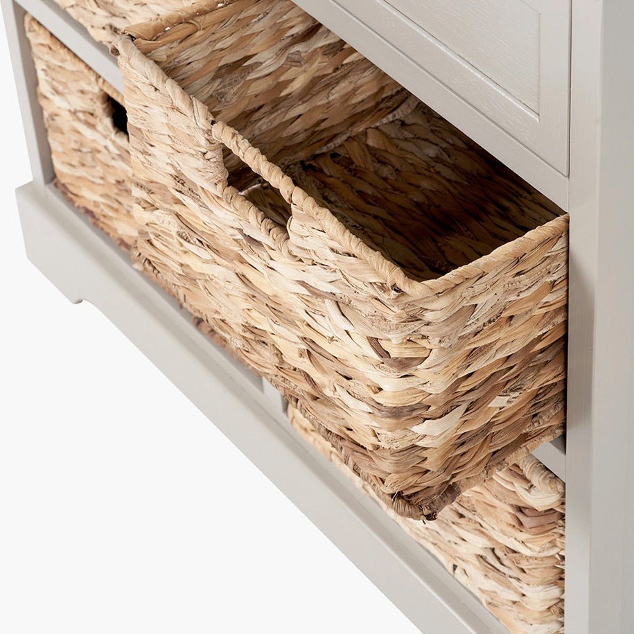 This unit in a putty finish combines elegant design with functional storage. Featuring a two wooden drawers alongside four banana leaf baskets, it offers versatile organisation options. The refined putty coloured tone enhances its sophisticated appeal, while the natural texture of the baskets introduces a subtle cottage core charm.