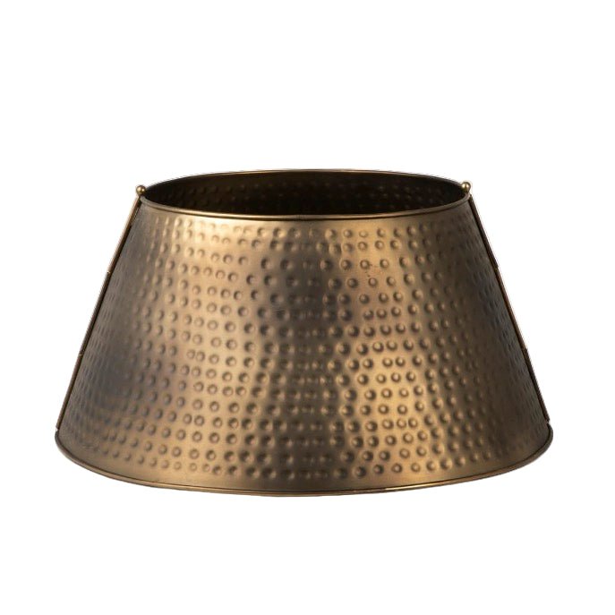 With its hammered metal design, this tree skirt consists of two halves secured by a pin that slides to join the two sections, making it simple to install and remove when watering is needed. Designed to conceal plastic pots that are less aesthetically pleasing and no more struggling to try and make it fit.