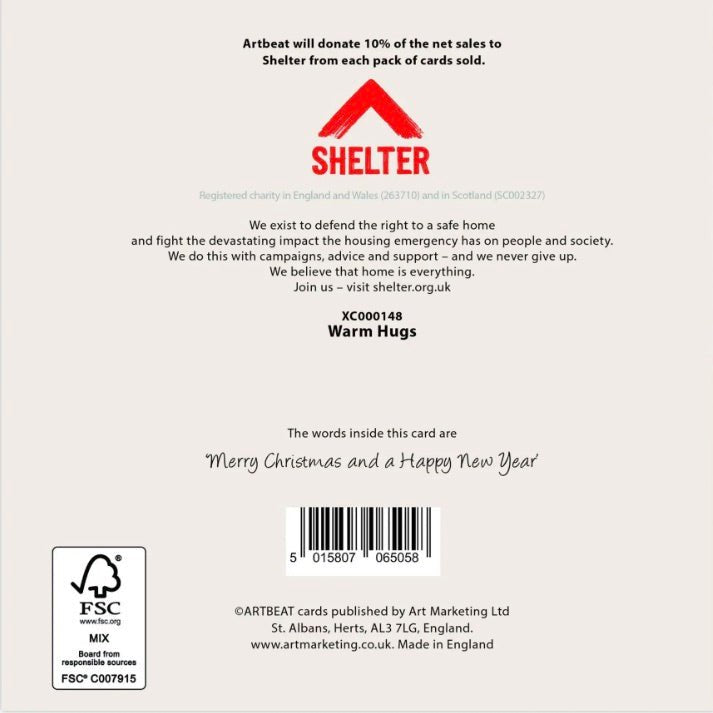 Beautiful hares hugging, bound to make the recipient smile. Each charity card is produced from sustainable wood pulp sourced from responsibly managed forests and is accredited with the FSC logo. The cards support Shelter’s vital charity work in the community.