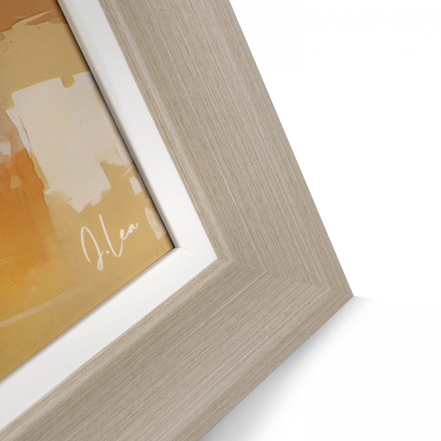 Harbour Glow by Joanna Lea captures the vibrant essence of a bustling quay on a warm summer day. The lively illustration reflects the coastal atmosphere through vivid citrus colors, contrasted with clean structural lines and fluid brush strokes. This unglazed wall art is framed in an oak wood-effect, adding a touch of personality to the print. Works perfectly with Golden Cove by the same artist if you're looking for a pair.