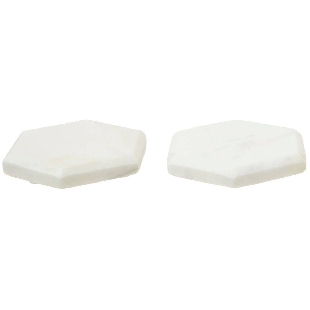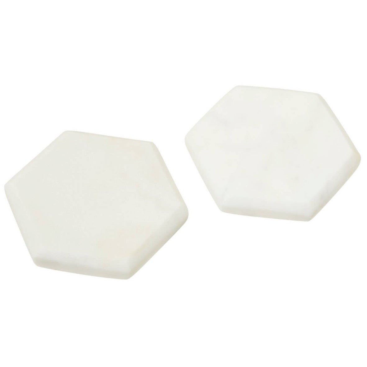 This set of four white marble hexagonal shaped coasters features an elegant, minimalist style. Crafted from sturdy marble, they combine functionality with simple style to shield surfaces from moisture and drink marks.