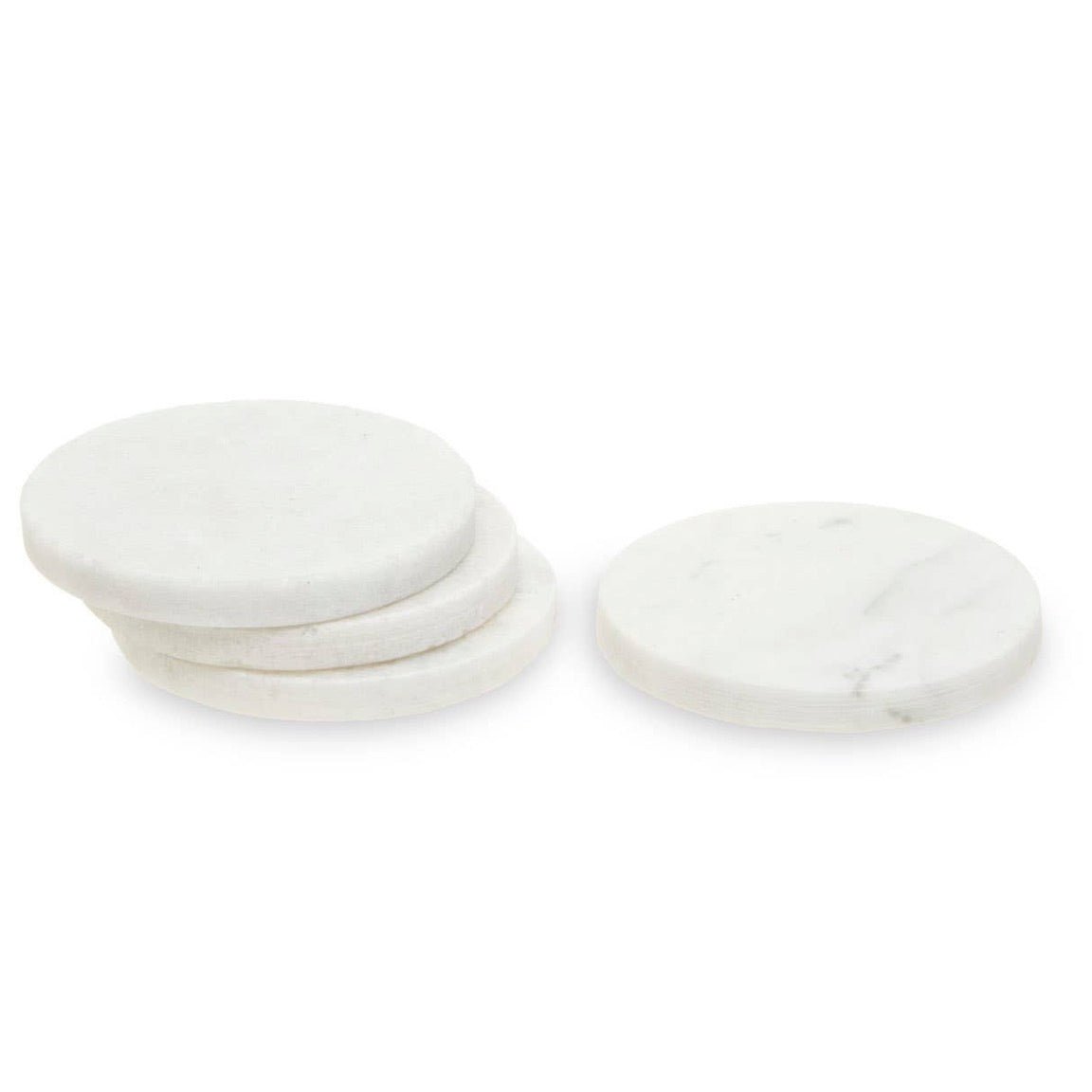 This set of four white marble round coasters features an elegant, minimalist style. Crafted from sturdy marble, they combine functionality with simple style to shield surfaces from moisture and drink marks.