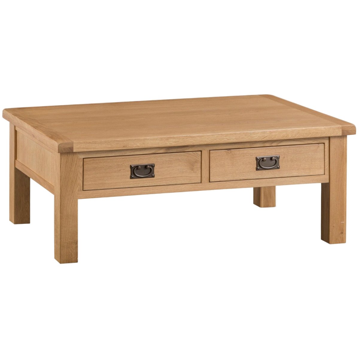 This oak rectangular large coffee table has two dovetailed drawers on wooden guides for additional hidden storage. Our Kirdford Oak Collection is one of the most diverse available and beautifully made with a natural finish and antique brass effect handles for a rustic feel that brings a relaxed look to your home.