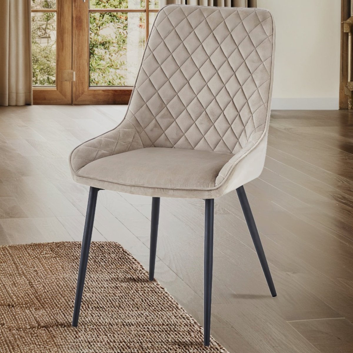 This pair of upholstered dining chairs feature a frame constructed using powder coated, hardened steel The seat is upholstered with quilted mink velvet