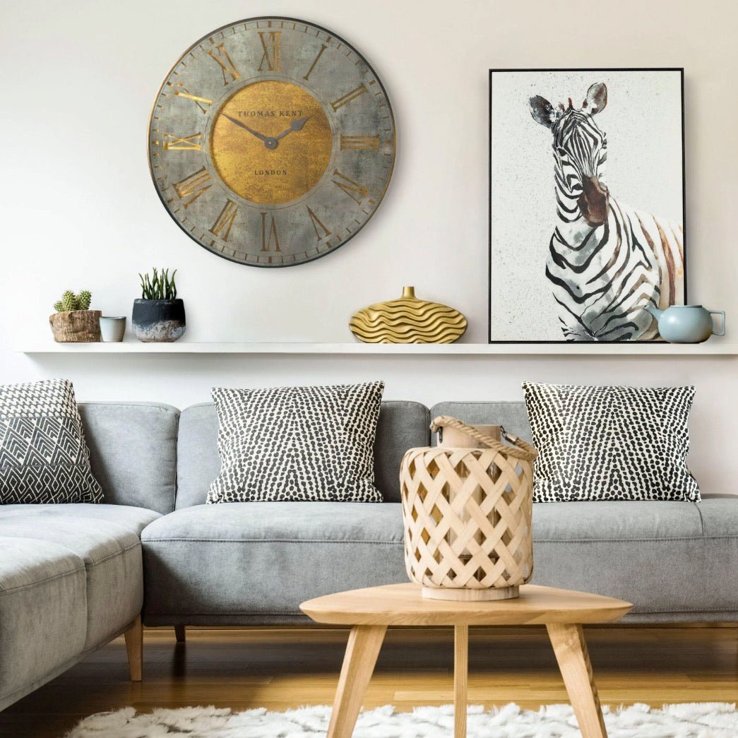 This striking Thomas Kent Florentine Grand Star Wall clock makes a statement with its large size. It has as stone effect printed on the glass and set against an antique effect gold face with a distressed brass effect.