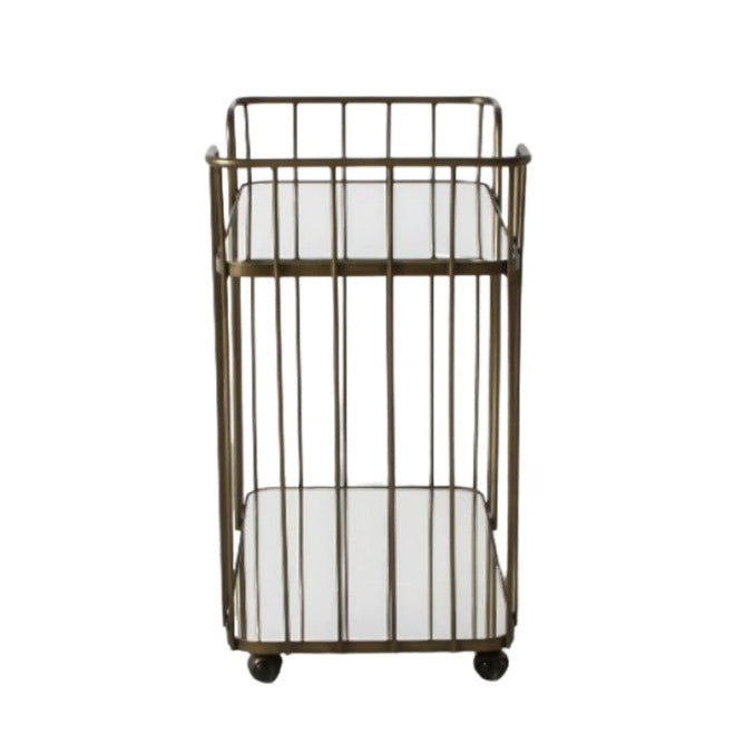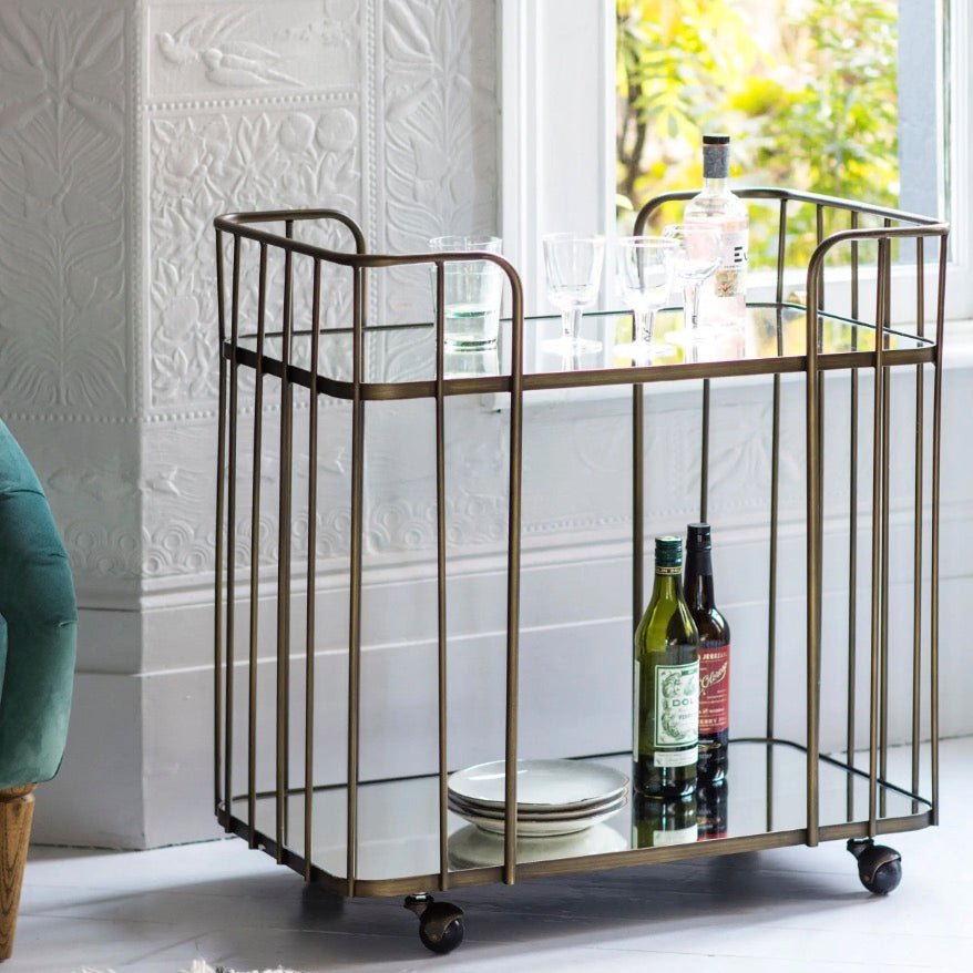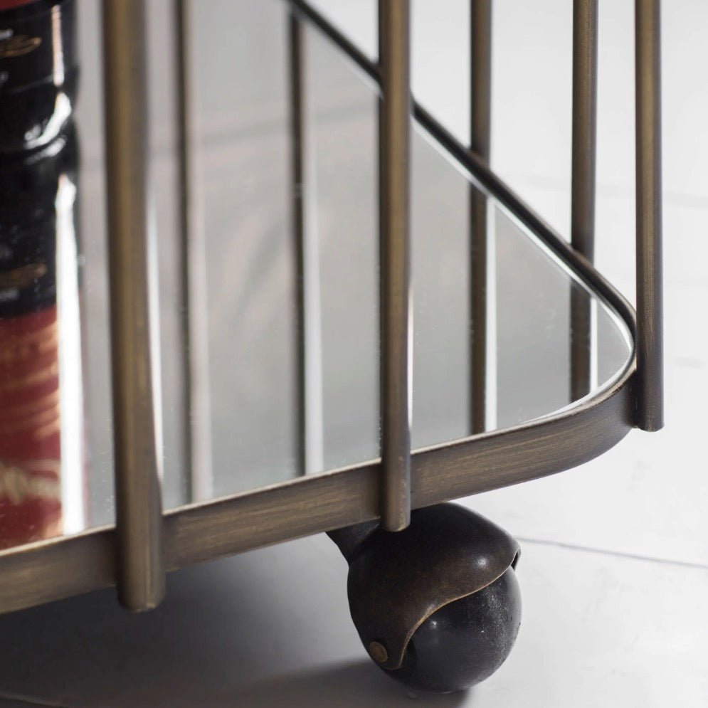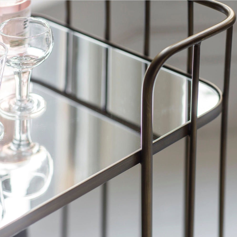 This Verna drinks trolley features a toughened mirrored glass top and shelf with an art deco styled antique bronze finished metal frame and castors so it can effortlessly be wheeled into position whenever required. Ideal for entertaining friends and family.