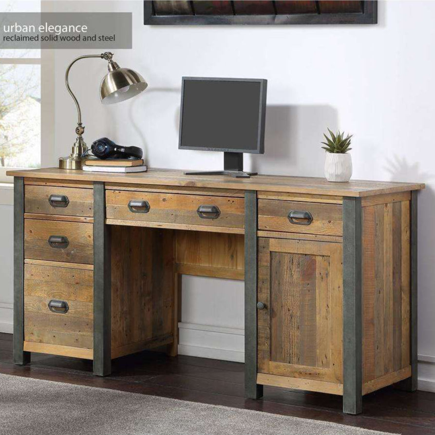 This stunning twin pedestal desk has a flip down keyboard drawer and plenty of storage. The industrial distressed, powder coated steel frame ensures an attractive matt finish, which combines beautifully with the solid reclaimed rough sawn wood.
