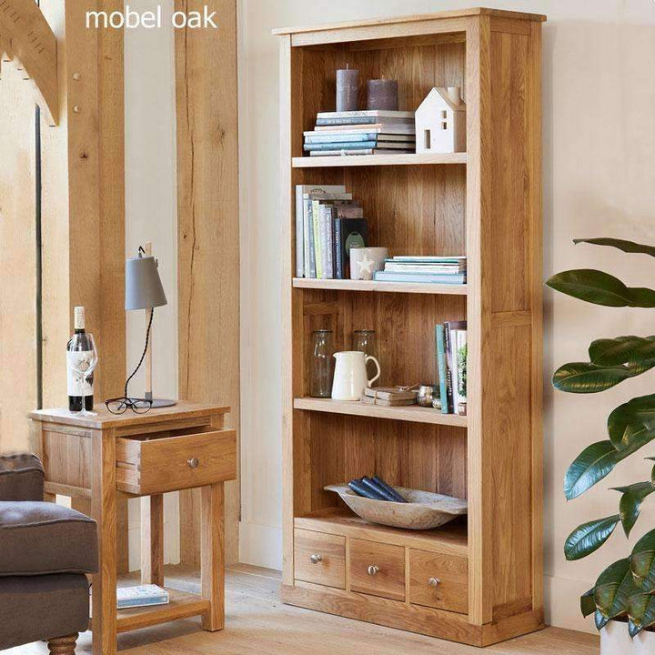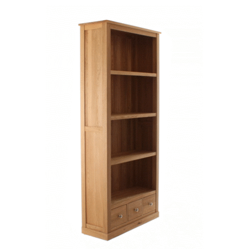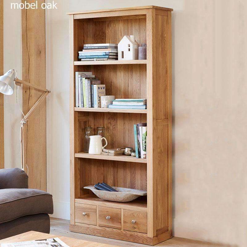 This tall large Mobel Oak bookcase has four shelves and three small drawers at the base of unit. The fixed shelves provide an extra sturdy solid oak bookcase and the three drawers with brushed steel knobs provide useful additional storage. It has a tongue and groove hardwood back and dovetailed drawer joints. Exceptional build quality that is designed to last.