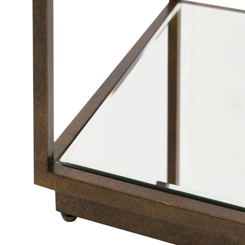 Compact yet stylish, this side table fits seamlessly into modern spaces. The bronze metal frame supports a glass top with a mirrored shelf underneath, providing subtle storage and reflecting light to brighten your room. Its minimalist design delivers quiet sophistication without fuss.