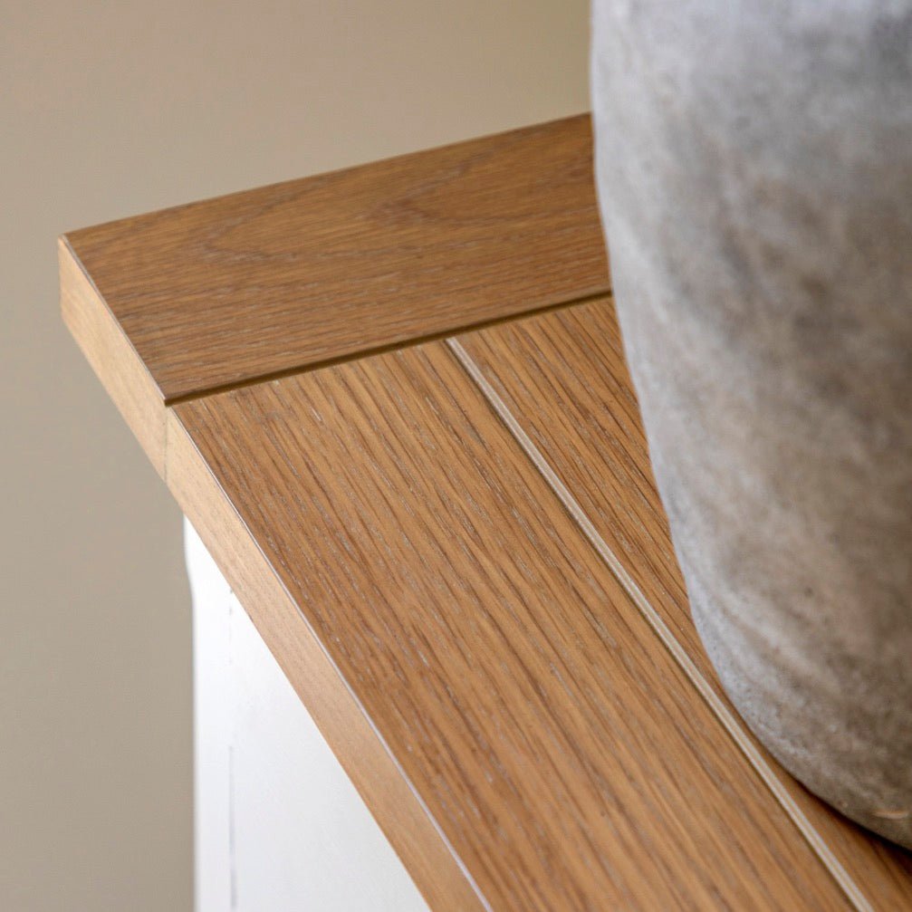 Store your essentials in style with this three drawer chest. The soft white painted base contrasts beautifully with the natural grooved top and metal handles, bringing understated country elegance to your bedroom. Each piece is handmade, so subtle colour variations may occur. Assembly required.