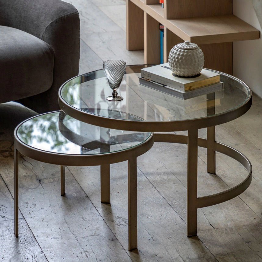 These nesting tables blend form and function beautifully. The pair features sleek bronze-toned metal frames with toughened glass tops and distinctive curved bases. Use them together for a layered look or separately to suit your space. Compact and versatile, they're the perfect solution for flexible living.ly, bringing modern elegance to classic and contemporary interiors alike.