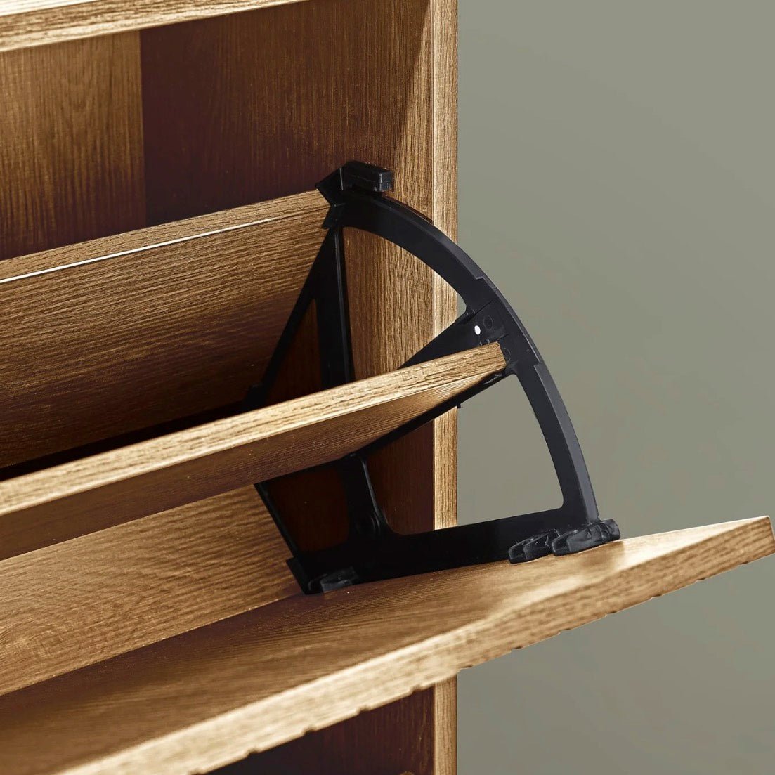 This compact 2-door shoe cabinet keeps footwear neatly stored in hallways or small spaces. Featuring warm oak effect finish with black groove detailing and recessed handles, it delivers contemporary style with understated charm. Drop-down doors conceal shoes while the top surface provides convenient space for keys or decorative items. Slimline design maximises room without clutter. Self-assembly required.