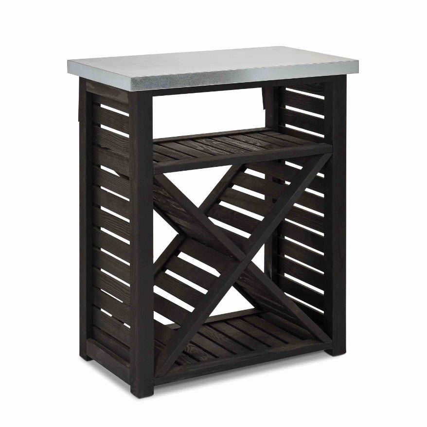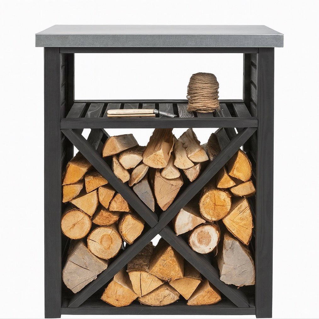 The Moreton Cross Log Store is designed specifically for compact spaces. Its unique cross pattern and slim frame offer both style and functionality. Securely attach it to a wall using the rear straps to prevent tipping. Constructed from durable, weather-resistant spruce, it features a galvanised sheet metal top that doubles as extra shelving alongside a convenient upper shelf for kindling.