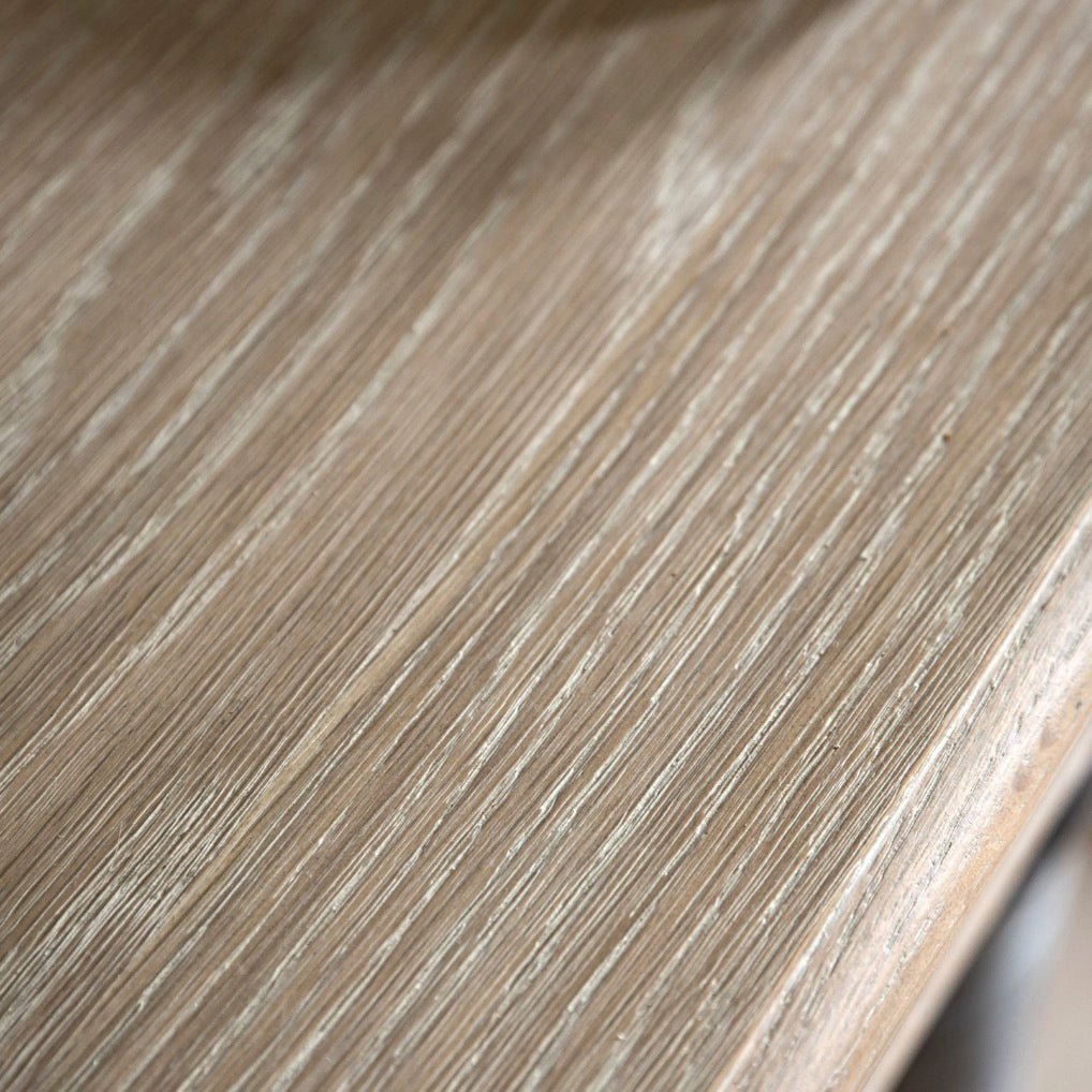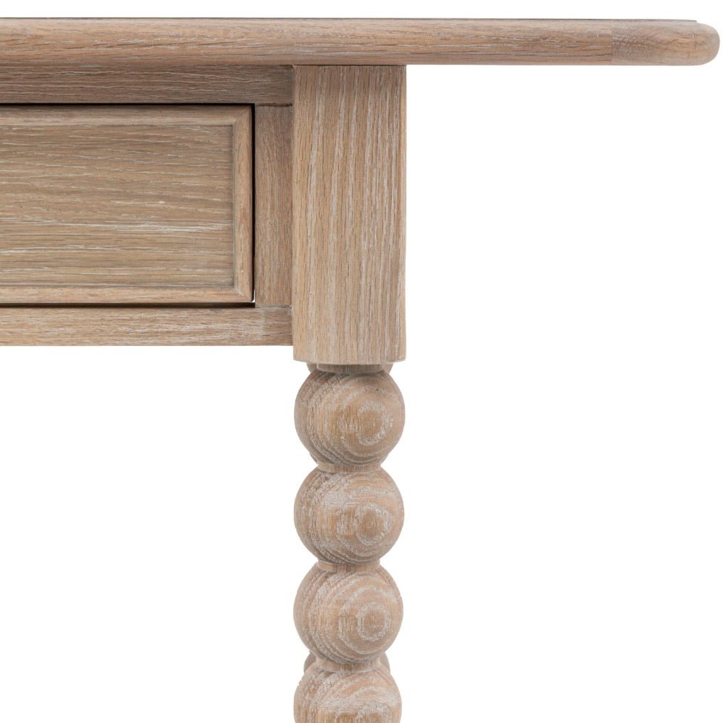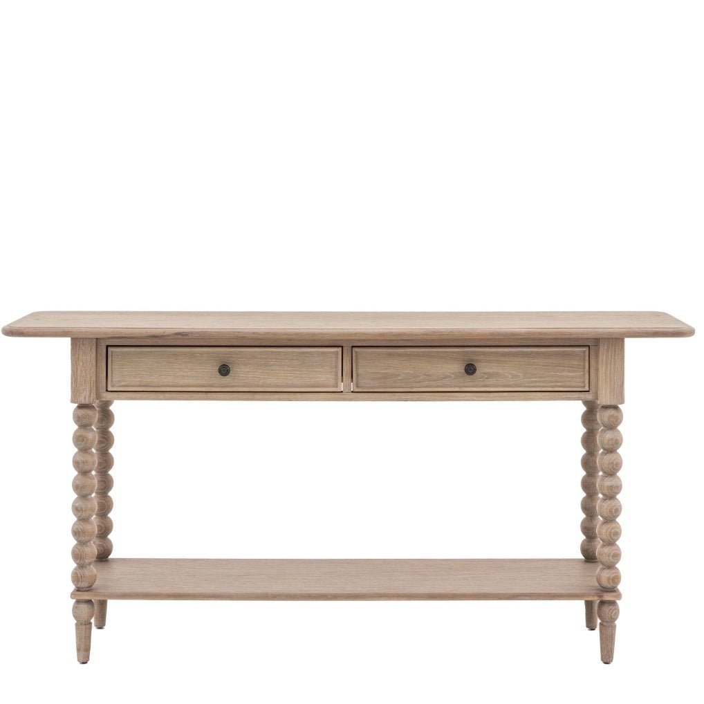 The gorgeous legs of this exquisite console table showcase an intricate bobbin design, meticulously handcrafted by skilled artisans using a lathe. Made of oak, it has 2 drawers for hidden storage, a low shelf and boasts a delicate lime wash finish.