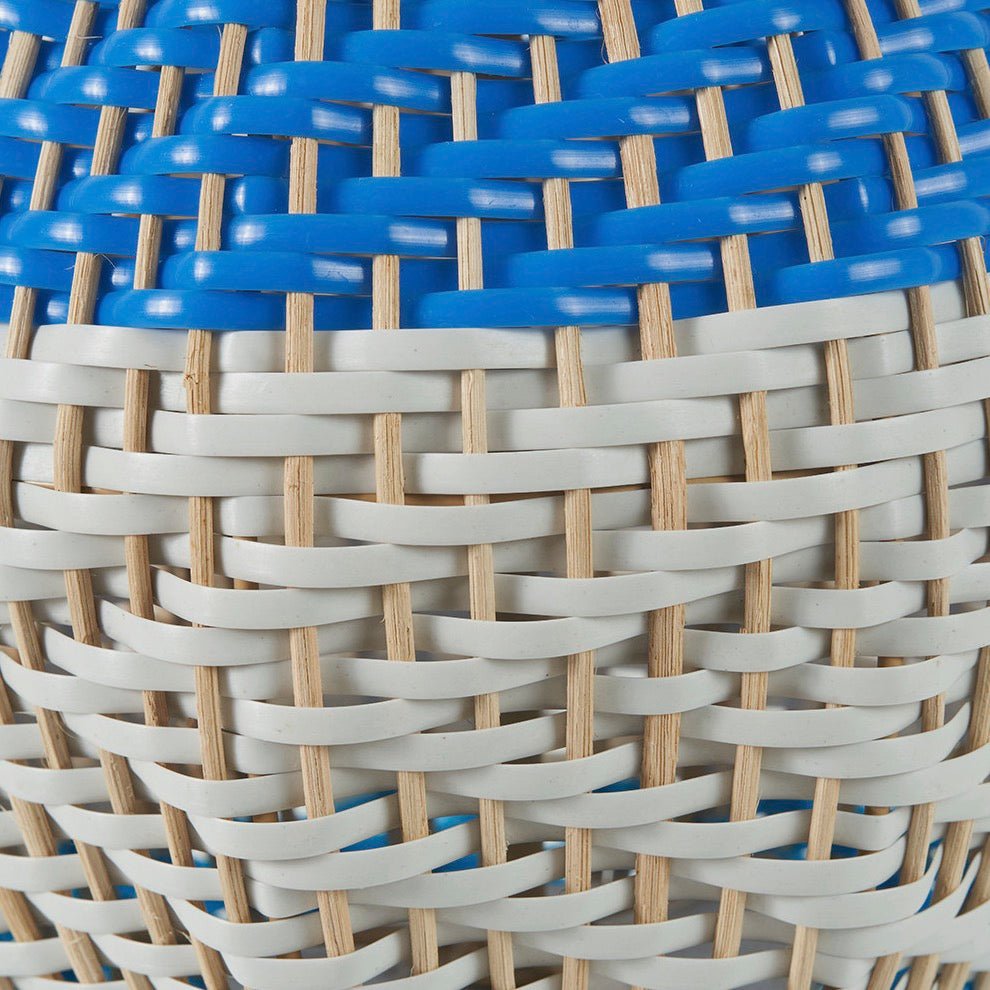 Created in collaboration with Designers Guild, this beautifully woven rattan table lamp is made from a combination of natural and synthetic rattan in vibrant cobalt blue and white hues, this lamp brings a natural, tactile element to your home. Its graceful curved form, intricate weaving, and lined white linen shade with a textured finish create a captivating centrepiece.