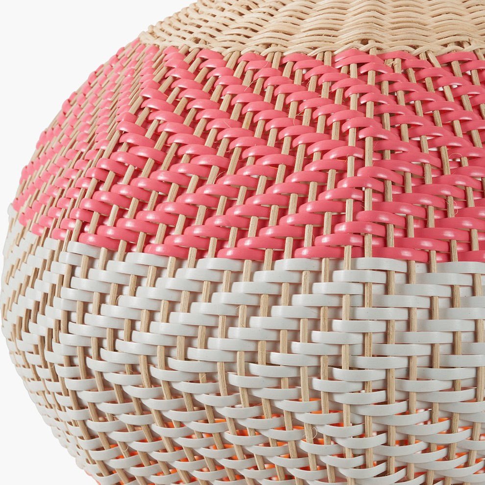 Created in collaboration with Designers Guild, this beautifully woven rattan table lamp is made from a combination of natural and synthetic rattan in vibrant pink, orange, and bright white hues, this lamp brings a natural, tactile element to your home. Its graceful curved form, intricate weaving, and lined white linen shade with a textured finish create a captivating centrepiece. Also available in a small size.