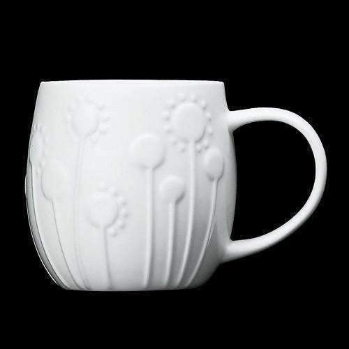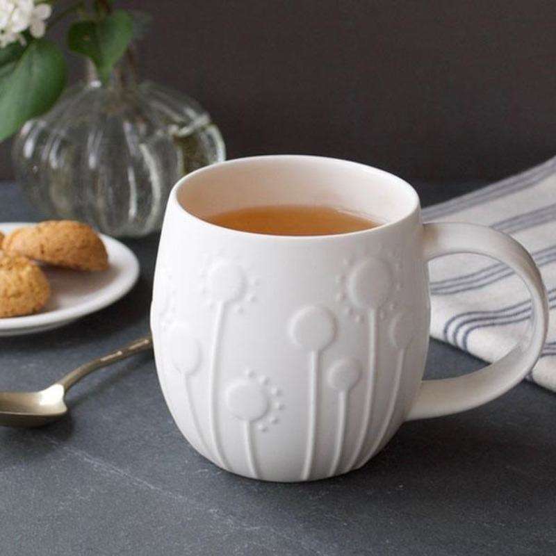 The Plum Lollipop white bone china mug has raised 3D patterns. It has a distinct plum-like shape which is comforting to hold, and features an embossed dimpled pattern. As they are made by hand, the mugs may differ from each other very slightly, which we think adds to their charm and character. The quality is first rate, just as you would expect from bone china made in England.