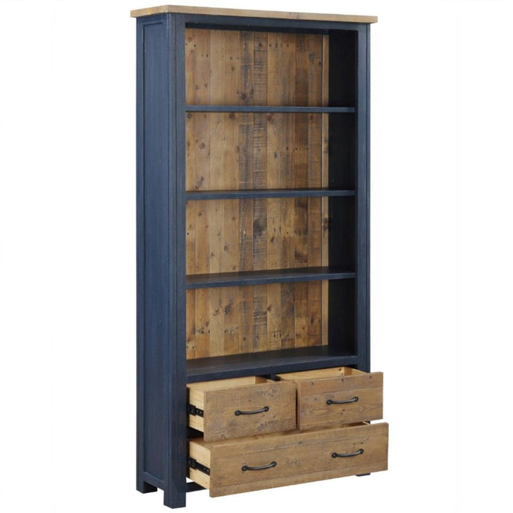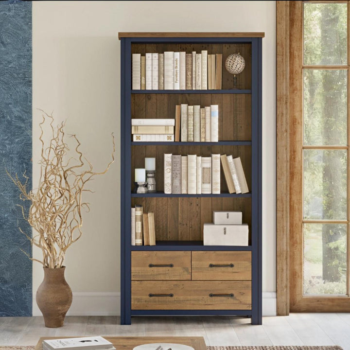 Tthe Splash of Blue large open bookcase features three storage drawers and four fixed shelves. Benefit from the ultimate storage and organisation solution for your living space. This bookcase provides ample space for books, decor, and more.