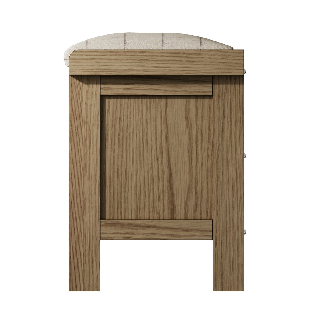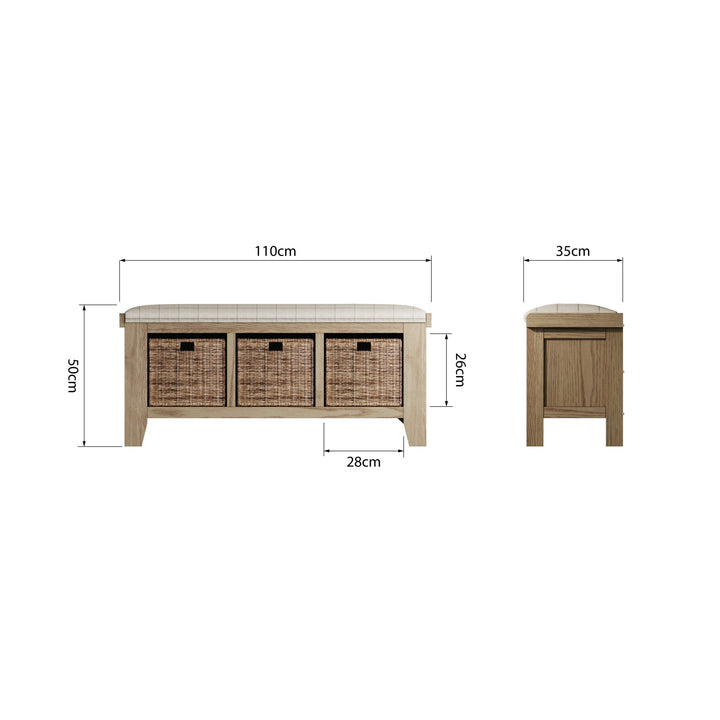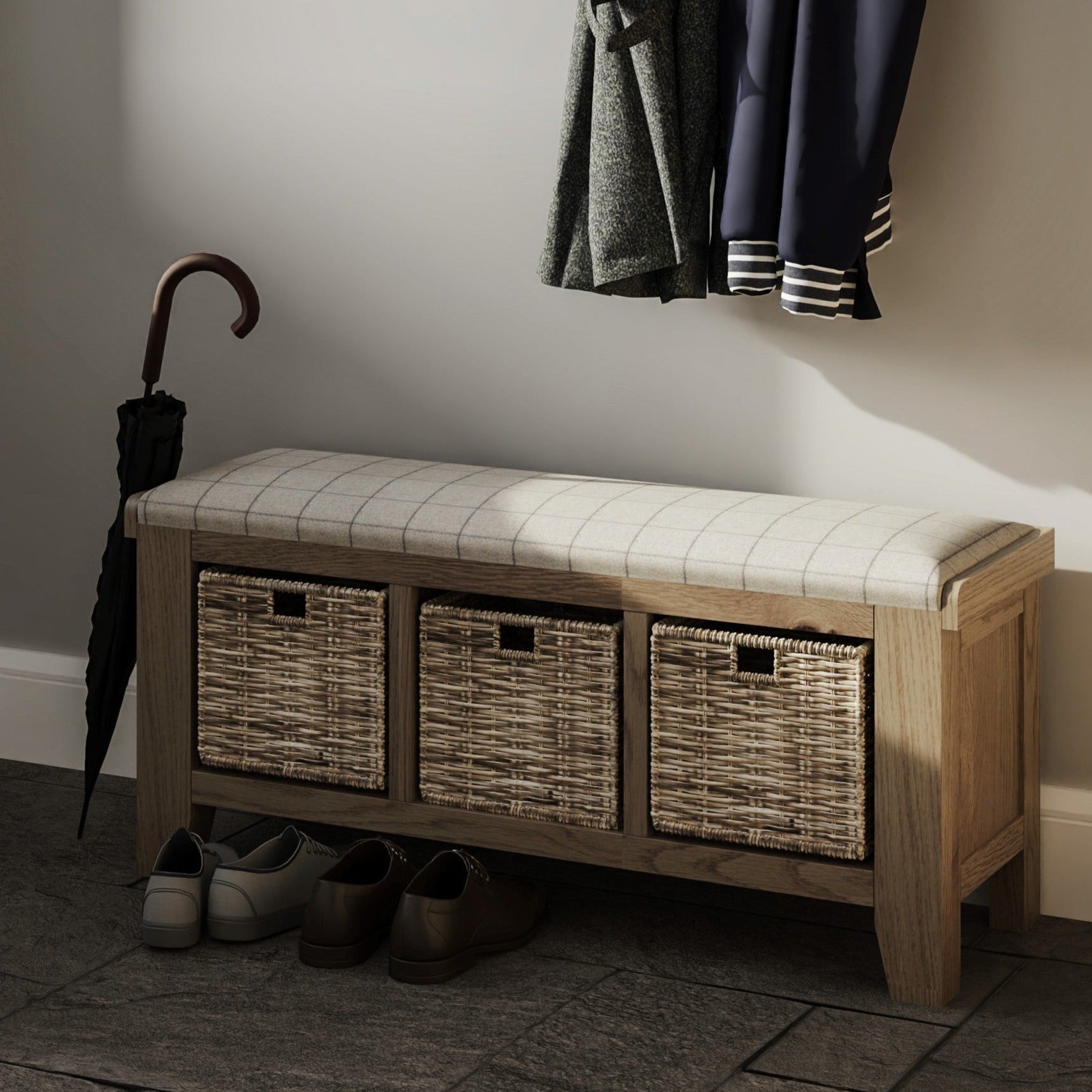 The timeless style of our Rusper Oak range with this hall storage bench in an oak finish, complete with 3 wicker baskets and smoked oak wooden top and upholstered natural check wool seat. The perfect practical way to bring a touch of class, contrast and character to your hallway.