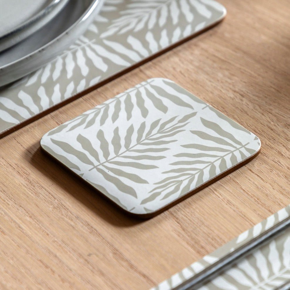 Bring understated elegance to your dining table with this four-piece set featuring coordinating placemats and coasters. The taupe and white leaf motif creates a subtle geometric pattern that complements any décor. Practical and durable, each piece boasts a wipeable matt surface and withstands temperatures up to 90 degrees.