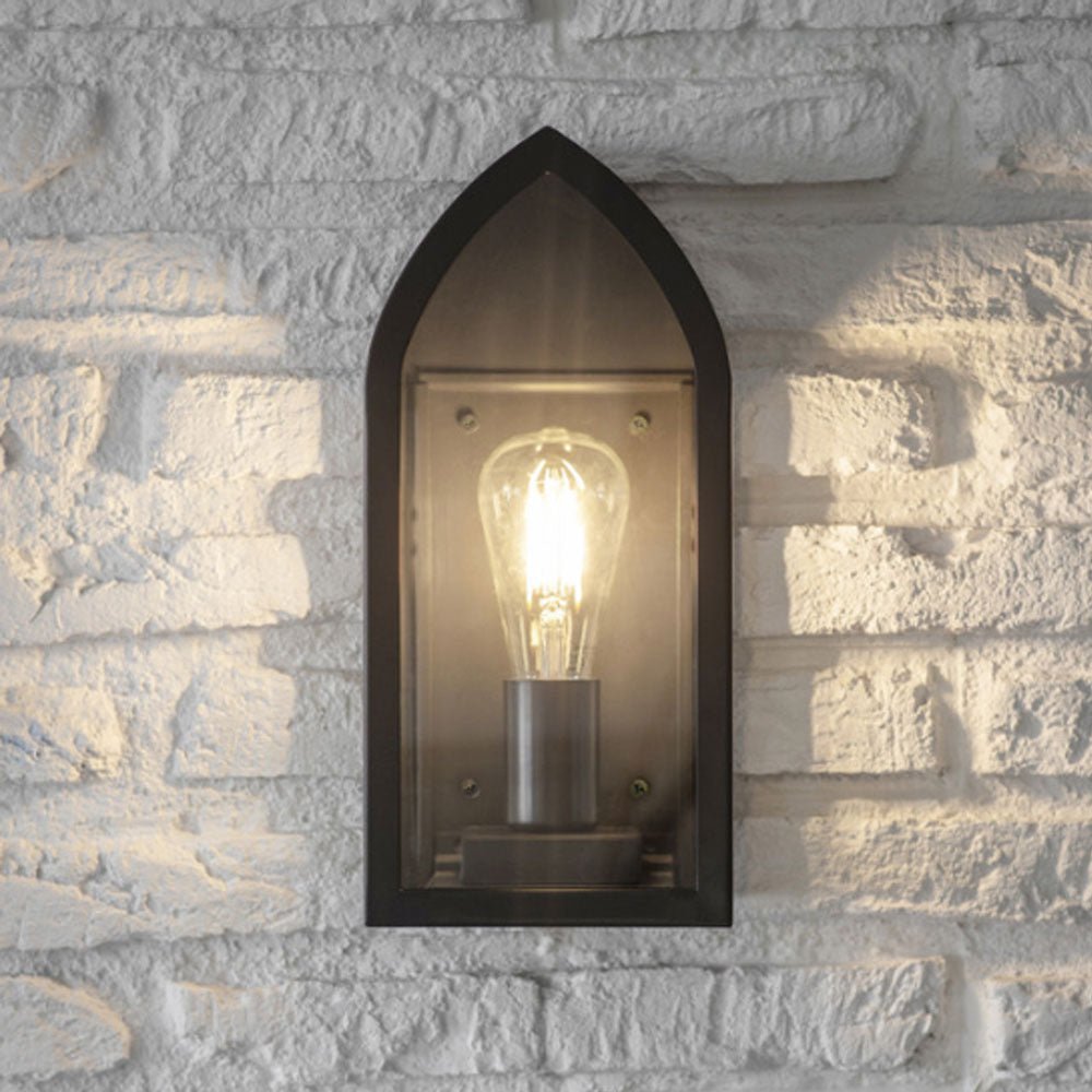 The Fairford outdoor wall light has the appearance of a gothic inspired lantern. Its carbon colour and church like shape makes it a very striking design and ideal for lighting pathways or doorways.