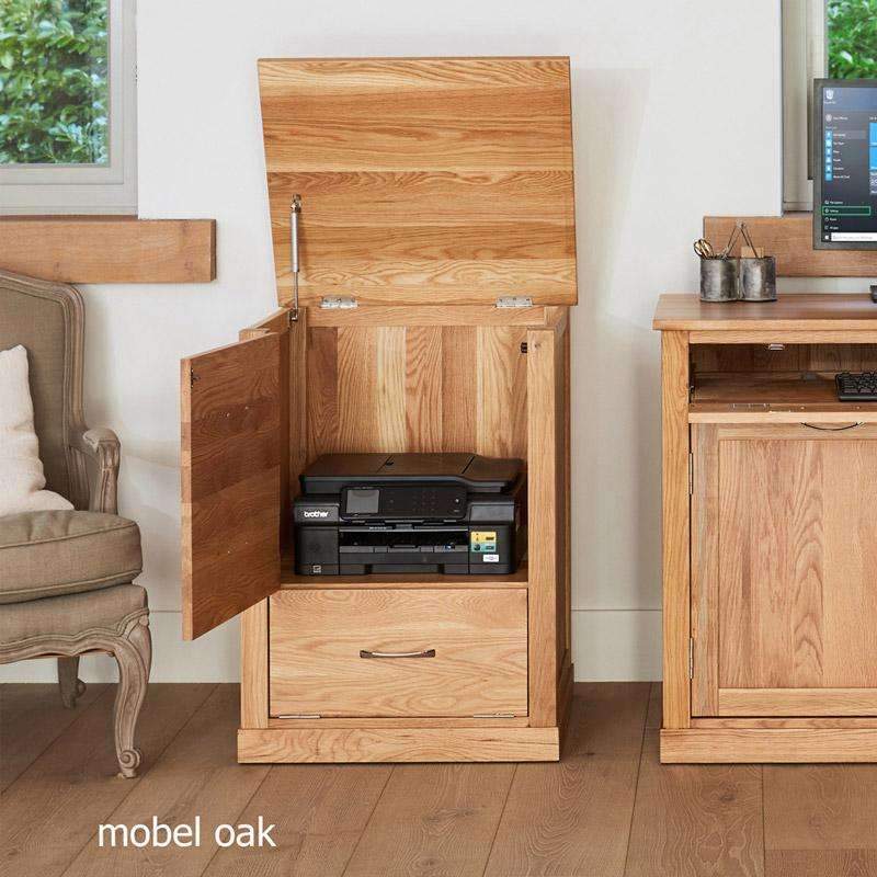 This Mobel Oak cupboard is designed to store a printer and has a lift up top allowing the lid on the printer to be fully opened and also has a hole for invisible wiring. A hydraulic lid damper allows the lid to remain in the open position whilst you work. The top has two false drawers which allow you access to the front of the printer if you need to clear a jam or replace toners.