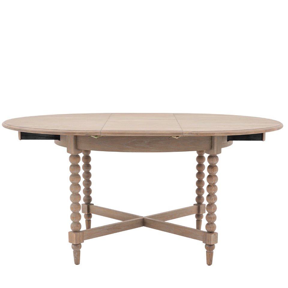 The gorgeous legs of this exquisite round dining table showcase an intricate bobbin design, meticulously handcrafted by skilled artisans using a lathe. Made of oak, the dining table boasts a delicate lime wash finish. Extendable and seats up to 6 people.