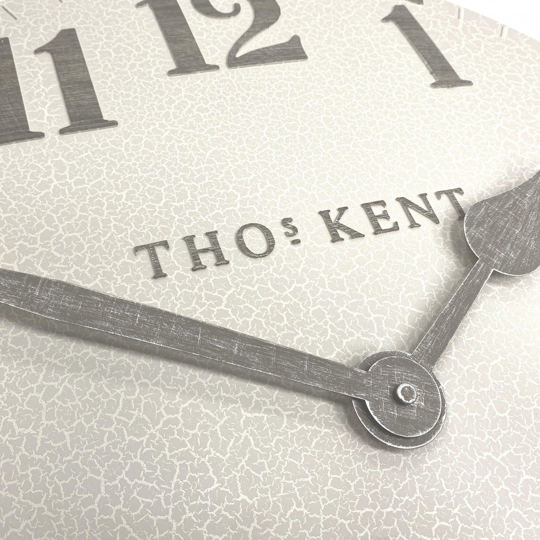 This large Thomas Kent Limestone Arabic Crackle Outdoor Wall Clock is a statement piece for any garden wall with its crackle pattern and stylish contrasting mink grey numbers and hands.