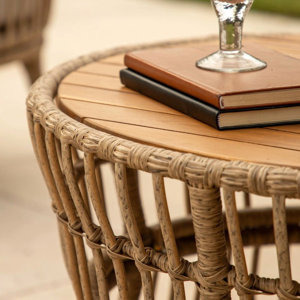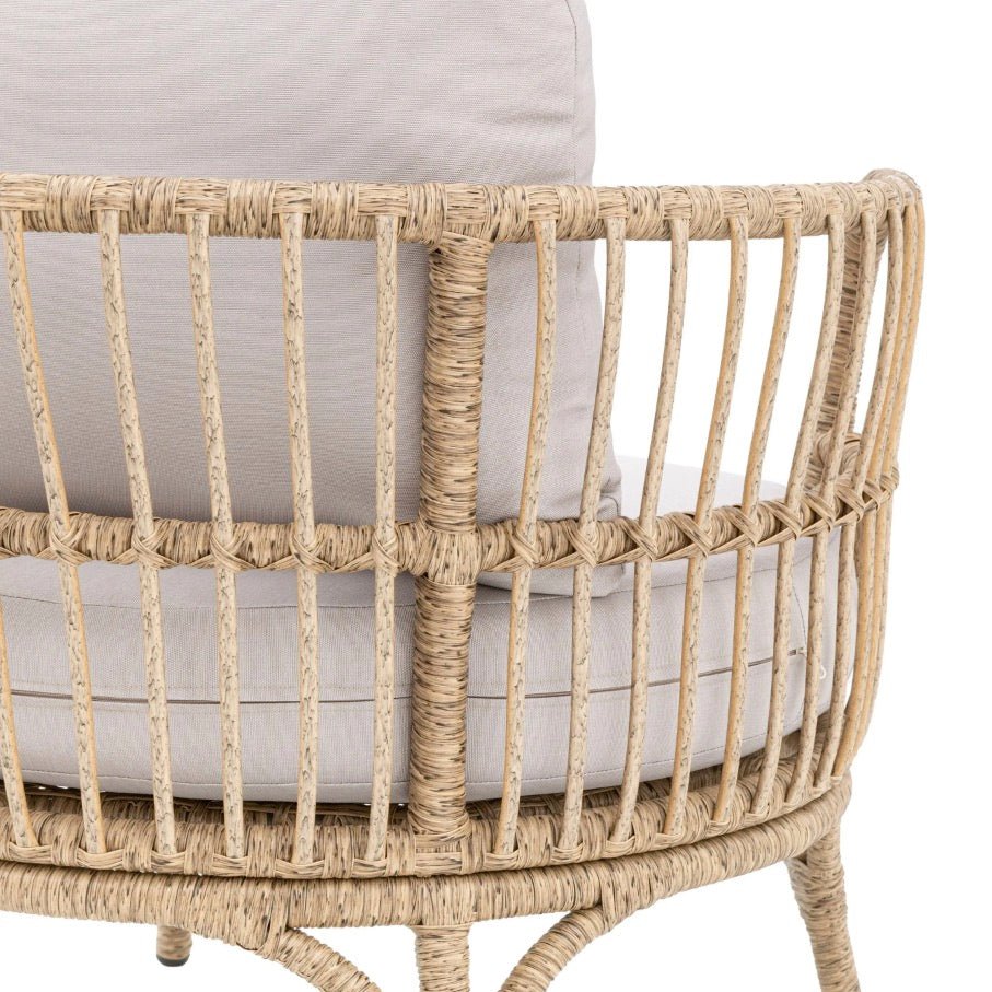 Create an inviting outdoor retreat with this bohemian lounge set, perfect for relaxed summer entertaining. Comprising two woven armchairs, a comfortable two-seater sofa, and a round Acacia wood coffee table, this collection combines style with durability. Sturdy steel frames are wrapped in 9mm brown woven detailing for an organic aesthetic, whilst plush grey fire-resistant foam cushions provide cosy seating. Designed to withstand outdoor conditions, this set brings effortless boho charm to any garden space.